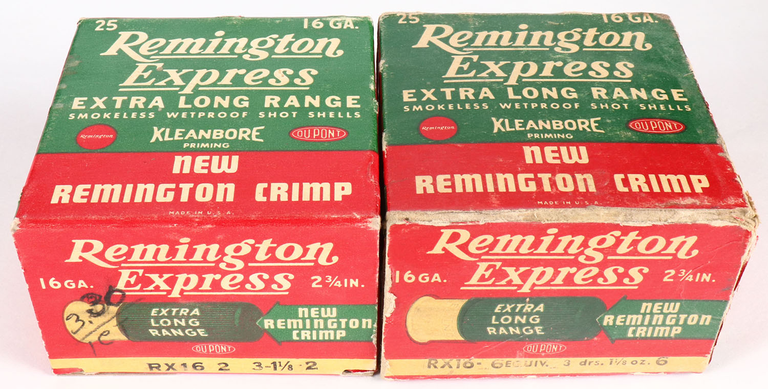 Lot of 2 Remington, 16ga., 1pc., Appears Full, shot size 2 & 6, multi-colored boxes. Grade: Very Good ++ - Value: 10 to 30