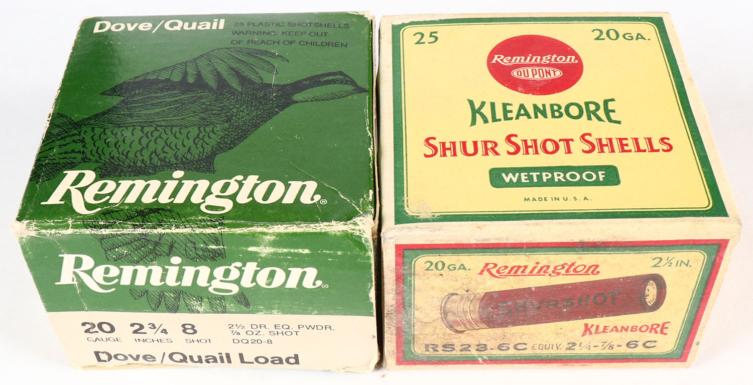 Lot of 2 Remington, 20ga., 1pc., Appears Full, shot size 8 & 6C, multi-colored box. Grade: Excellent - Value: 10 to 30