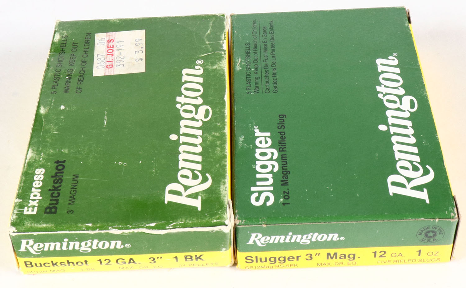 Lot of 2 Remington, 12ga., 1pc., Appears Full, shot size 1 Buck & Rifled Slug, multi-colored box. Grade: Very Good - Value: 8 to 20