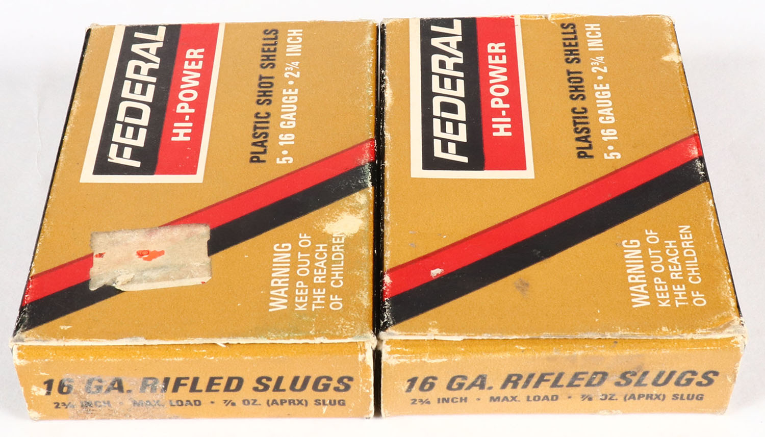 Lot of 2 Federal, 16ga., 1pc., Appears full, shot size Rifled Slug HP, multi-colored box. Grade: Very Good ++ - Value: 10 to 20