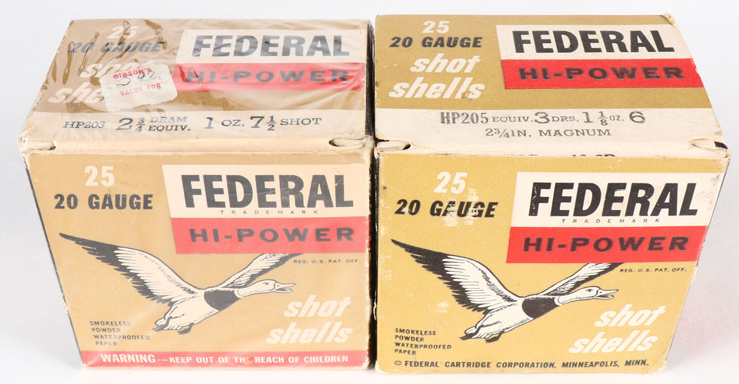 Lot of 2 Federal, 20ga., 1pc., Appears Full, shot size 7 1/2 & 6, multi-colored box. Grade: Very Good ++ - Value: 10 to 30