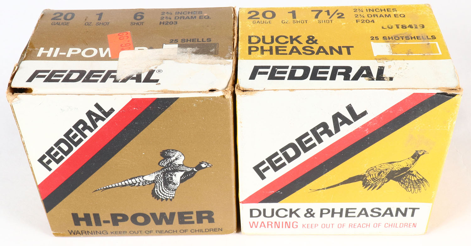 Lot of 2 Federal, 20ga., 1pc., Appears full, shot size 6 & 7 1/2, multi-colored boxes. Grade: Very Good ++ - Value: 10 to 30