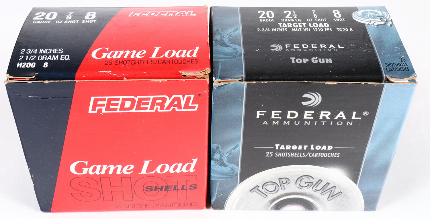 Lot of 2 Federal, 20ga., 1pc., Appears full, shot size 8, multi-colored boxes. Grade: Excellent - Value: 10 to 30