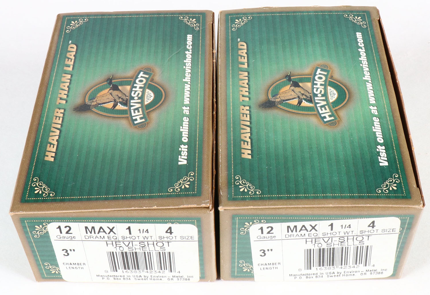 Lot of 2 Hevi-Shot, 12ga., 1pc., Appears Full, shot size 4, multi-colored boxes. Grade: Excellent - Value: 10 to 30