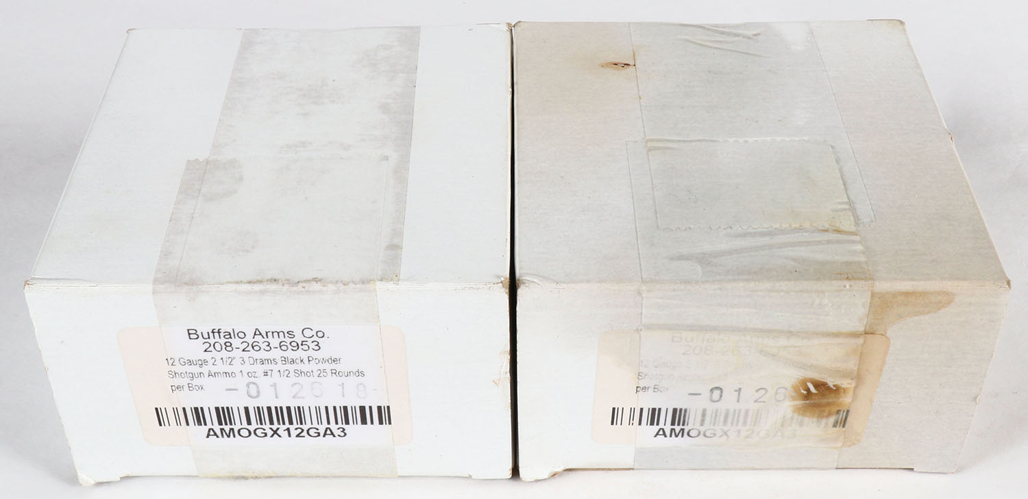 Lot of 2 Bufalo Arms Co., 12ga., 1pc., Appears Full, shot size 7 1/2, white boxes with black label. Grade: Very Good - Value: 10 to 30