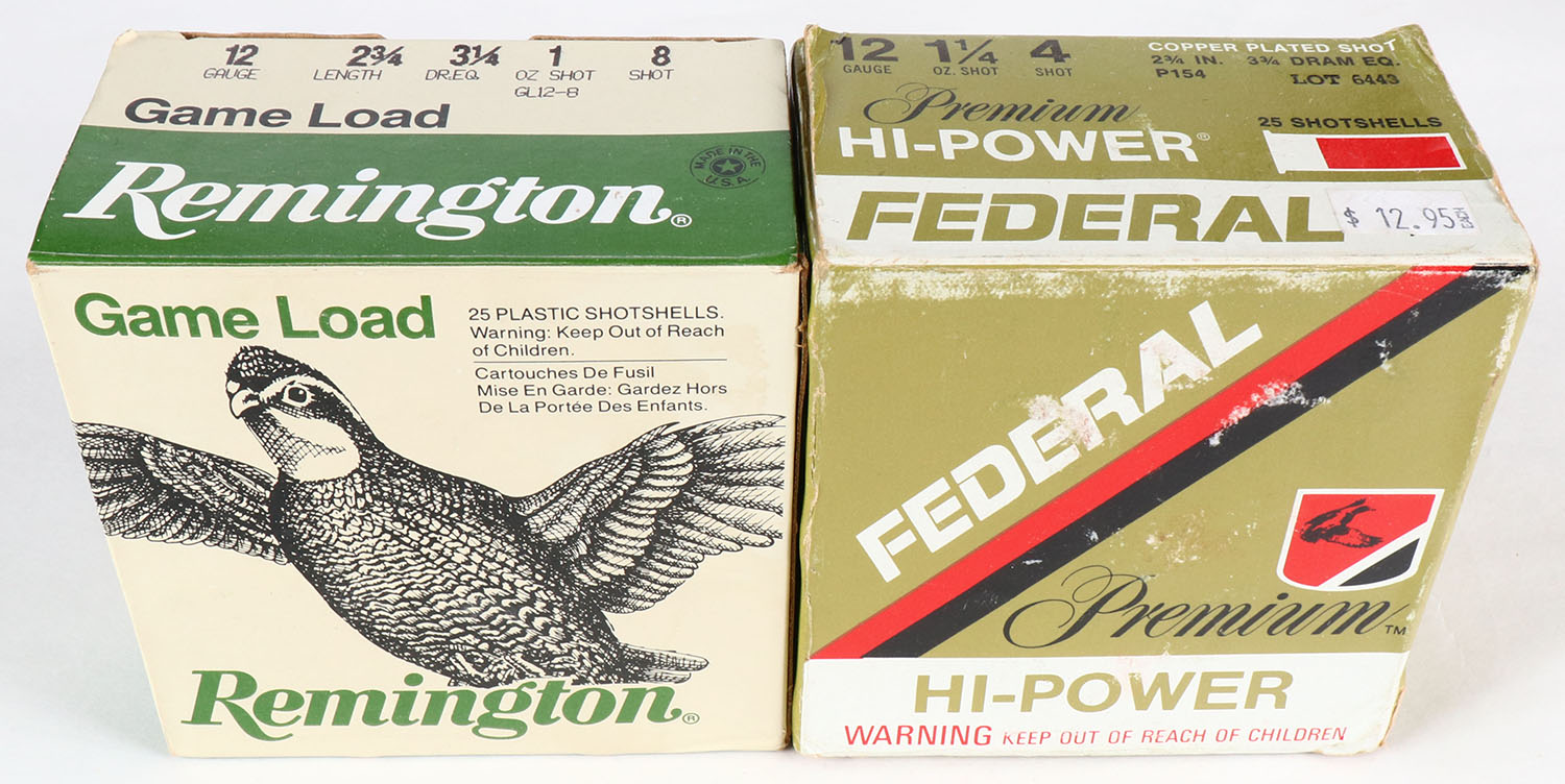 Lot of 2 Federal & Remington, 12ga., 1pc., Appears Full, shot size 8 & 4, multi-colored boxes. Grade: Very Good ++ - Value: 10 to 30