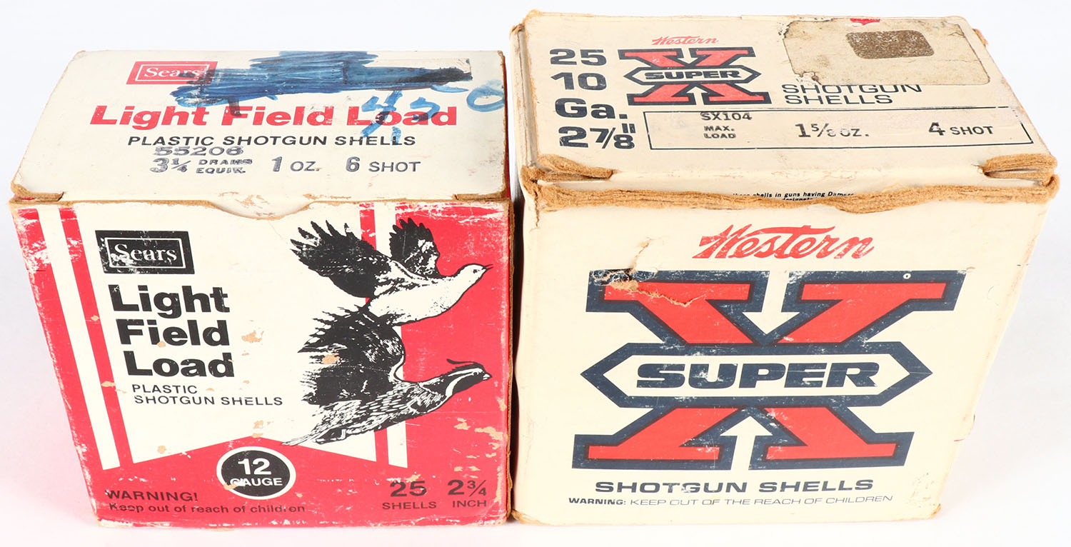 Lot of 2 Western & Sears, 10ga. & 12ga., 1pc., Appears Partial, shot size 4 & 6, multi-colored boxes. Grade: Good ++ - Value: 10 to 30