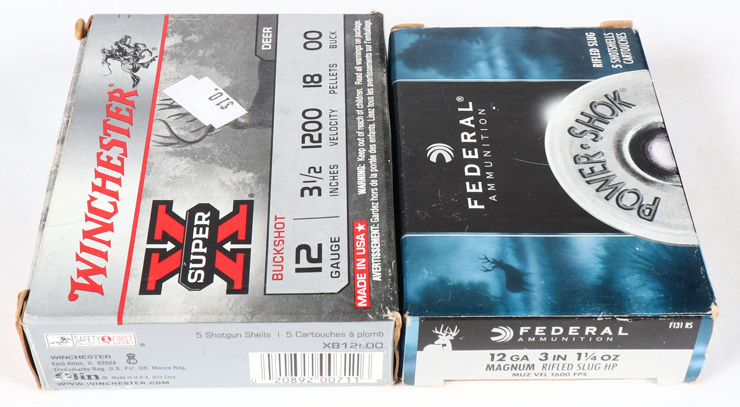 Lot of 2 Winchester & Federal, 12ga., 1pc., Appears Full, shot size 00 BUCK & Rifled Slug, multi-colored boxes. Grade: Very Good - Value: 10 to 30