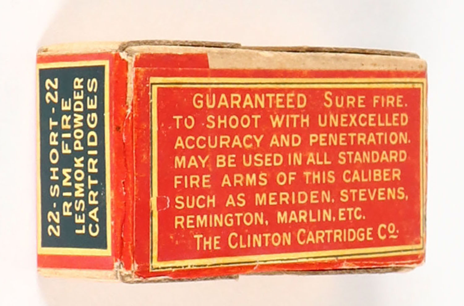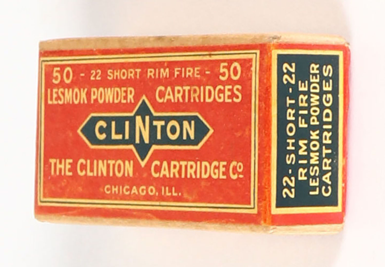 Clinton, Lesmok Powder Cartridges, .22 Short, RHWeb: CLINT-1 S-2b, Empty, 2pc. Buff box with red & green wraparound label, box is solid with excellent color, very minor shelf wear, corners are mostly sharp, edges are crisp, label is intact. Grade: Excellent - Value: 10 to 50