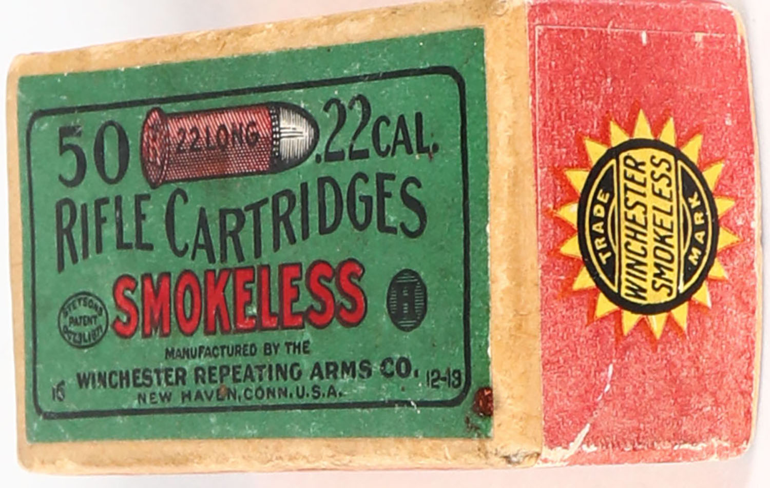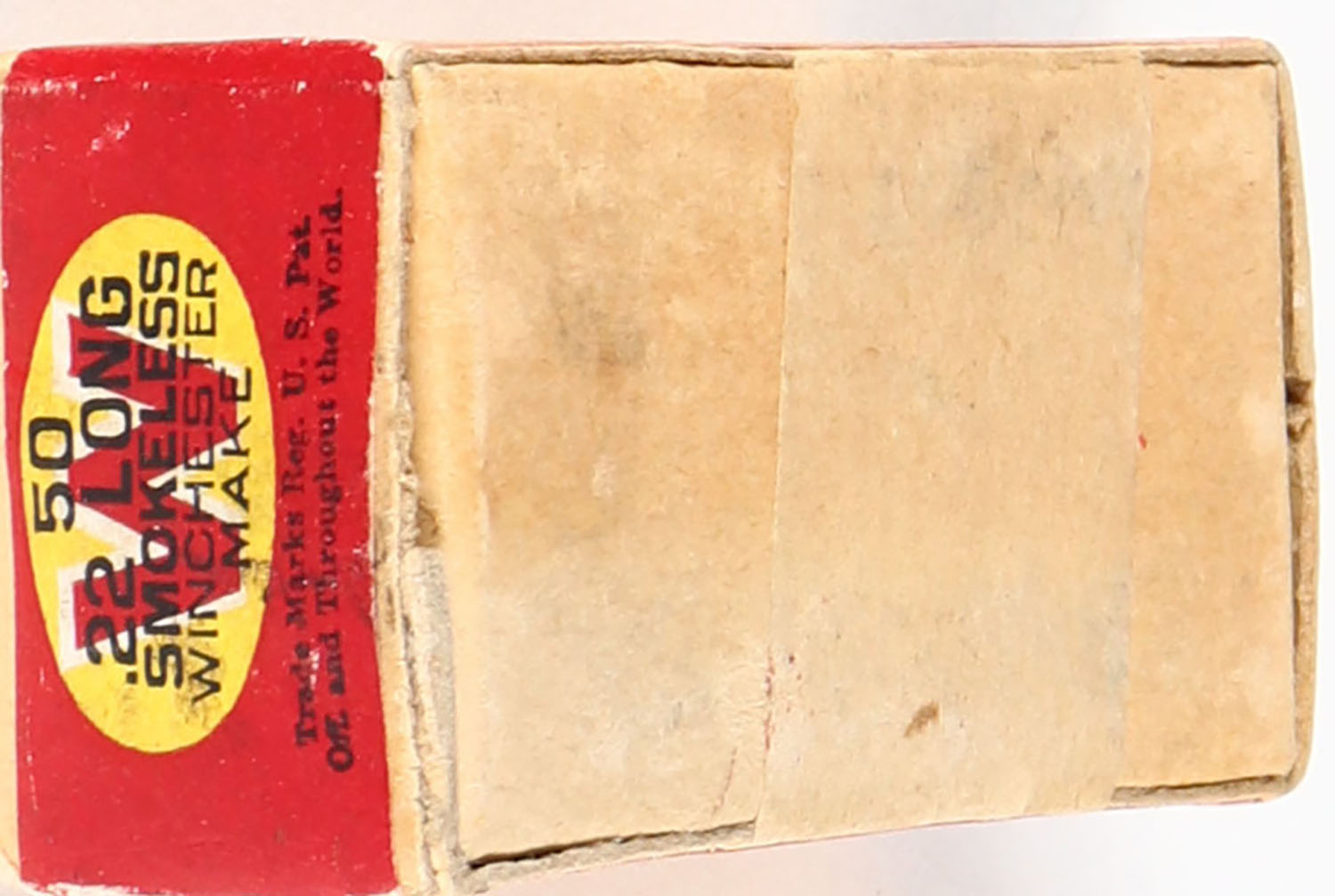 Winchester, Smokeless Rifle Cartridges, .22 Long, Greaseless Bullets, RR: WRA-65 L-22b, FULL & SEALED, 2pc. Buff box with green top & red side sealing labels, box is solid with excellent color, very minor age soiling & corner wear, edges are crisp, labels are intact. Grade: Excellent + - Value: 100 to 300