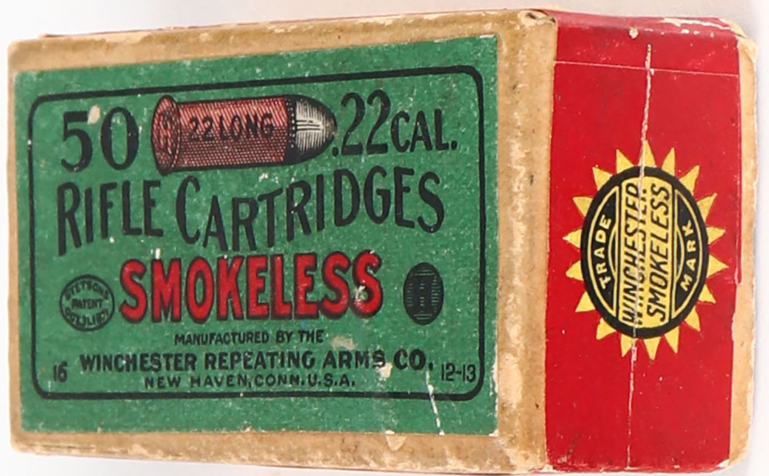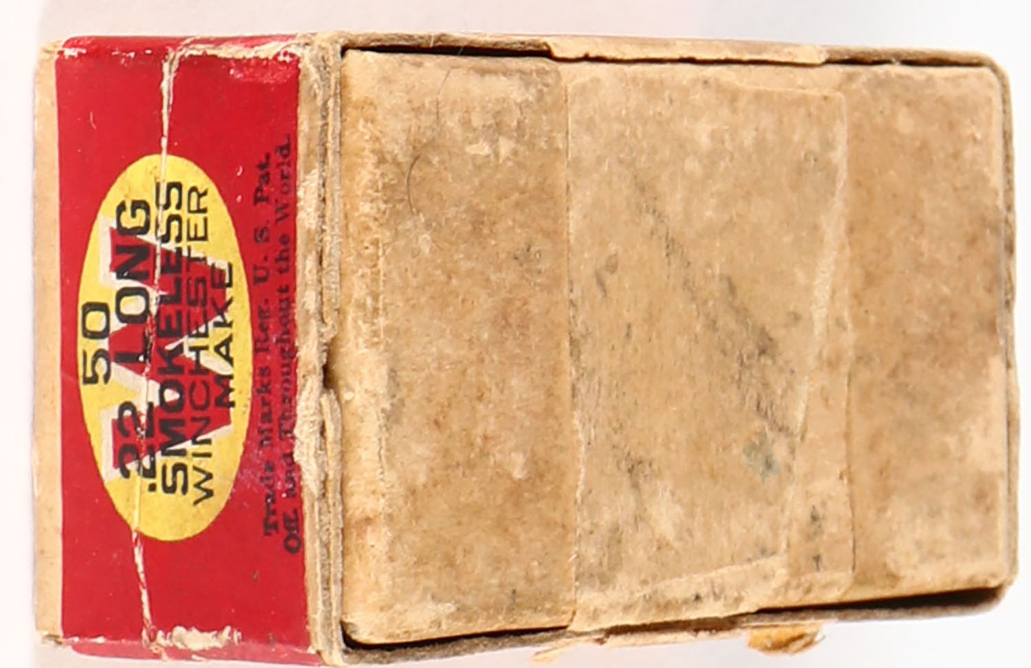 Winchester, Smokeless Rifle Cartridges, .22 Long, Greaseless Bullets, RR: WRA-65 L-22b, Partial 31rds., 2pc. Buff box with green top & red side sealing labels, box is solid with excellent color, very minor shelf wear, minor edge & corner wear, labels are intact, ammo is excellent. Grade: Very Good ++ - Value: 20 to 80