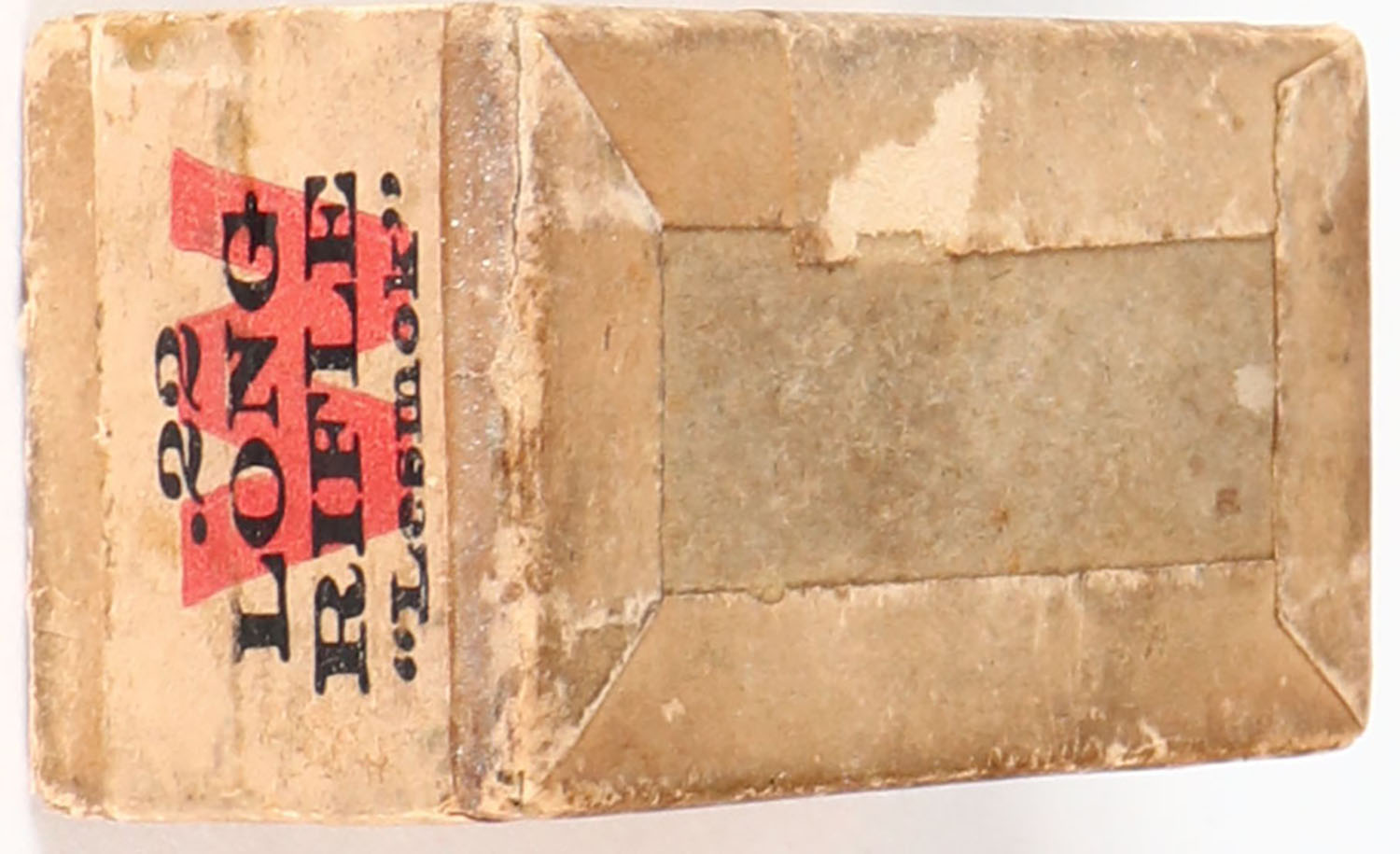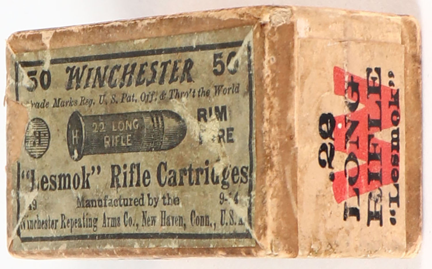 Winchester, ''Lesmok'' Rifle Cartridges, .22 Long Rifle, RR: WRA-121 LR-26d, FULL & SEALED, 2pc. Buff box with green top & off-white side sealing labels, box is solid with good color, age soiling, some shelf wear, minor edge & corner wear, labels are intact. Grade: Very Good - Value: 40 to 200