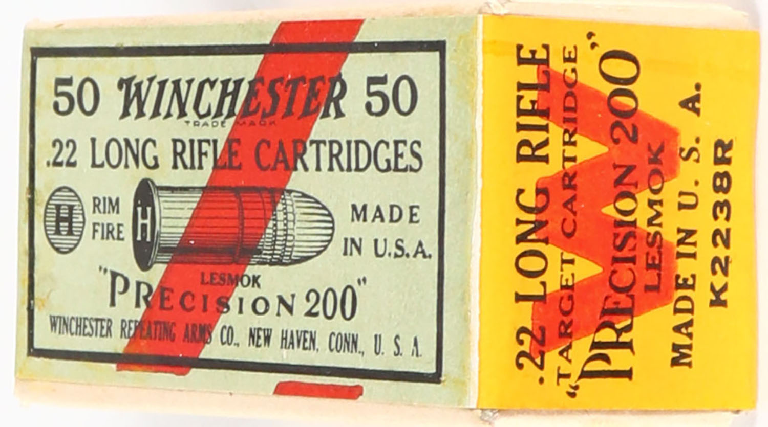 Winchester, ''Precision 200'', .22 Long Rifle, RR: WRA-129 LR-43c, FULL & SEALED, 2pc. Buff box with green red & white wraparound label, box is near mint with minty color, only very minor staining to top & bottom, corners are sharp, edges are crisp, label is intact. Grade: Excellent ++ - Value: 60 to 180