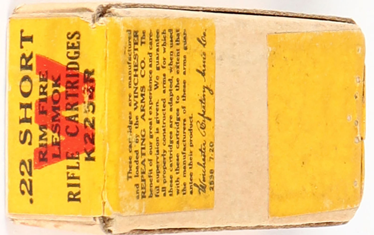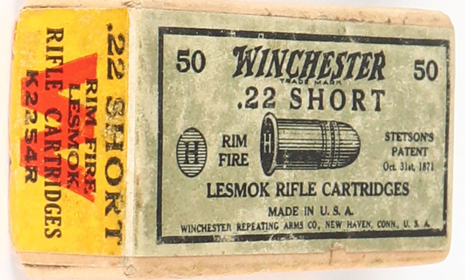 Winchester, Lesmok Rifle Cartridges, .22 Short, RR: WRA-177 S-65c, FULL & SEALED, 2pc. Buff box with green & yellow wraparound label, box is solid with excellent color, very minor shelf & corner wear, edges are mostly crisp, label is intact. Grade: Excellent - Value: 40 to 120