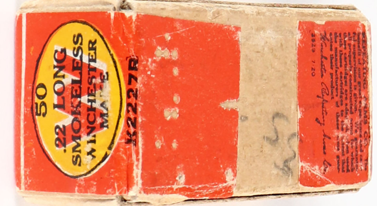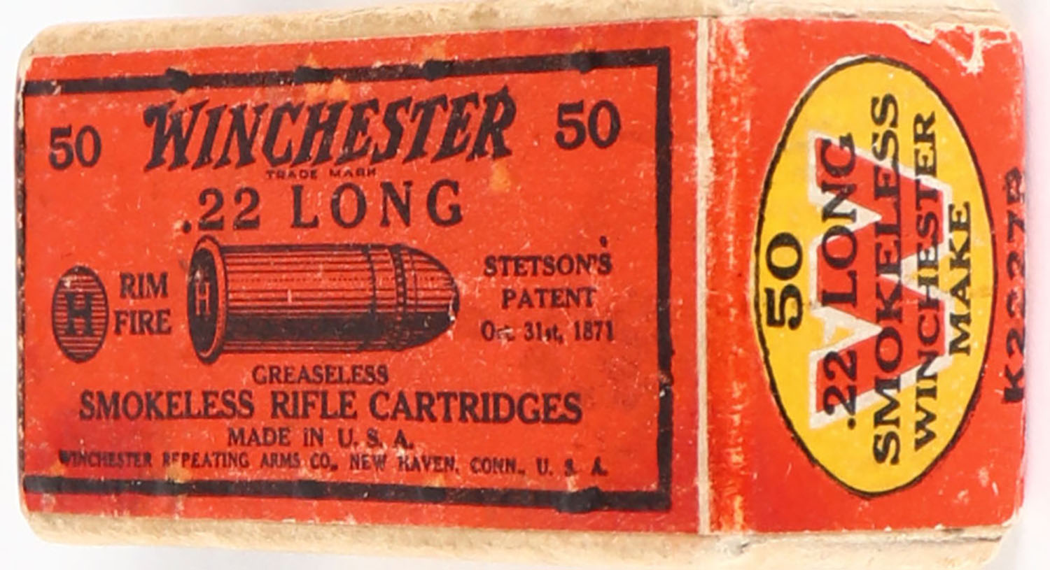 Winchester, Smokeless Rifle Cartridges, .22 Long, RR: WRA-179 L-57b, FULL & SEALED, 2pc. Buff box with red wraparound label, box is solid with excellent color, very minor shelf & corner wear, edges are crisp, label is intact. Grade: Excellent + - Value: 100 to 300