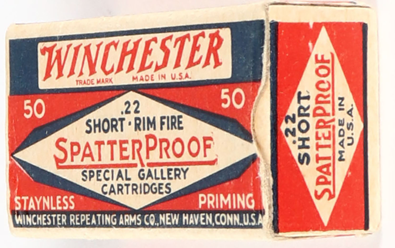 Winchester, SpatterProof, .22 Short, Special Gallery Cartridges RHWeb: WRA-51A, S-1b. Full, 1pc. Red buff & blue box, box is solid with excellent color, minor edge wear, on right end, very minor corner ding on top front corner, corners otherwise mostly sharp, edges are mostly crisp, end flaps are solid, ammo is excellent. Grade: Excellent + - Value: 500 to 1500