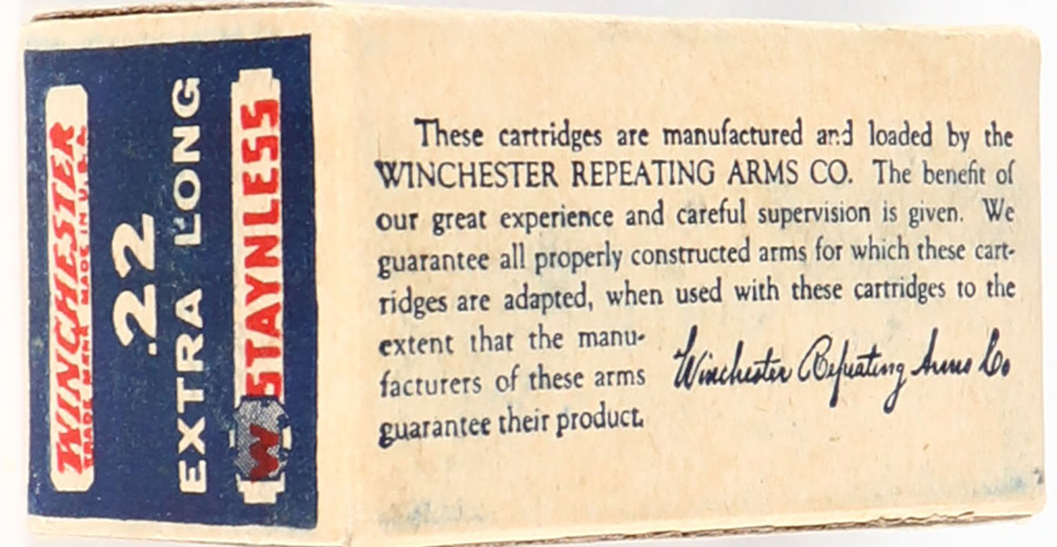 RARE! Winchester, Staynless, .22 Extra Long, RHWeb: WRA-12B XL-1c, Full, 1pc. Blue white & red box, box is very nearly mint with minty color, only very minor age soiling to bottom, corners are sharp, edges are crisp, end flaps are solid, ammo is very good to excellent. Grade: Excellent ++ - Value: 400 to 1200