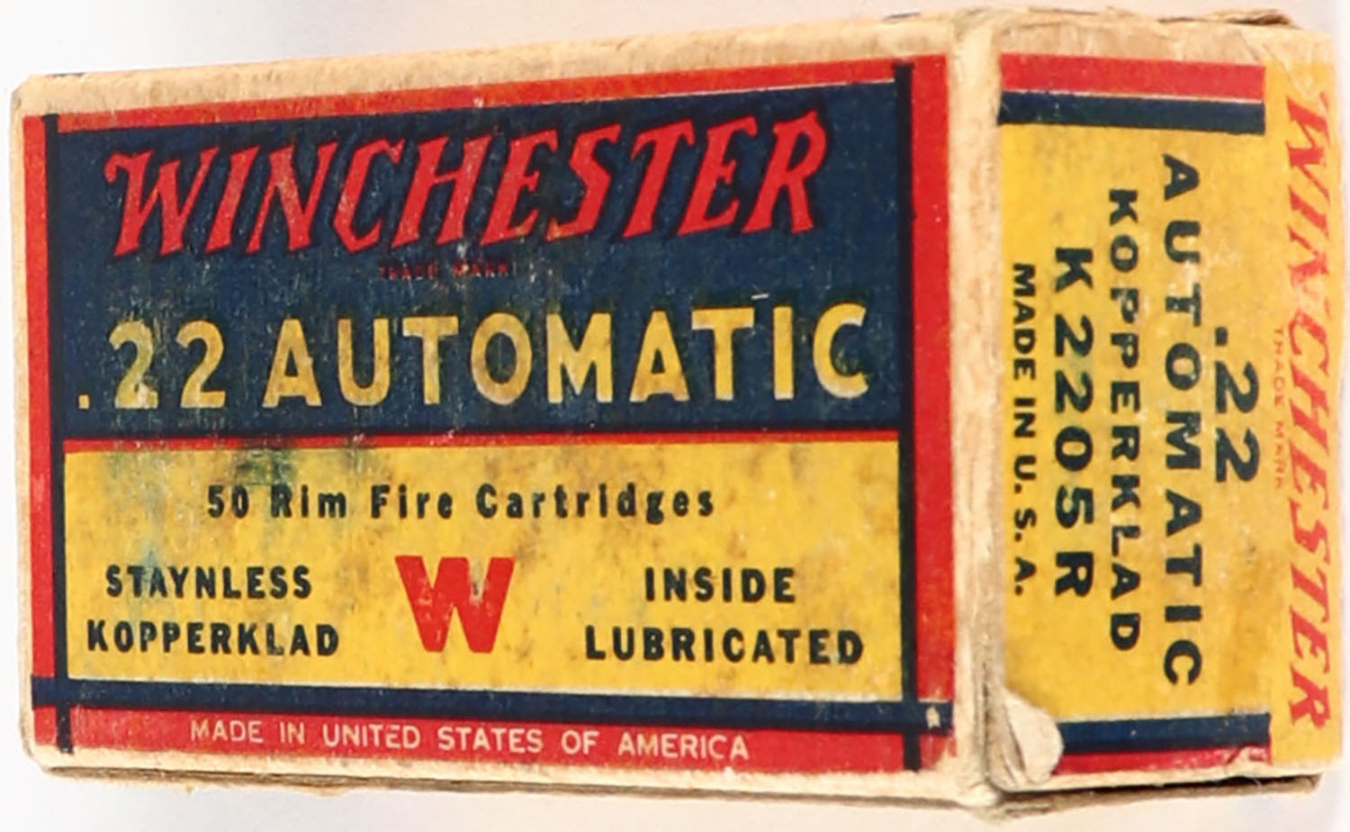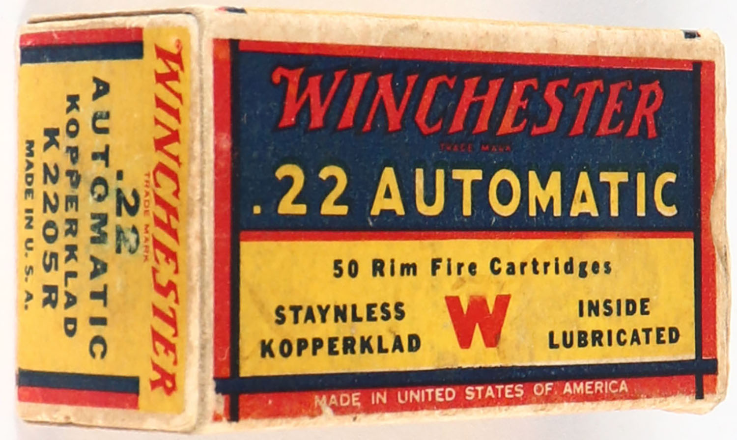 Winchester, Staynless Kopperklad, .22 Automatic, Inside Lubricated, RHWeb: WRA-15 WA-1b, Full, 1pc. Yellow blue & red box, box is solid with very good to excellent color, some age soiling & corner wear edges are mostly crisp, end flaps are solid, ammo is excellent. Grade: Very Good ++ - Value: 20 to 80