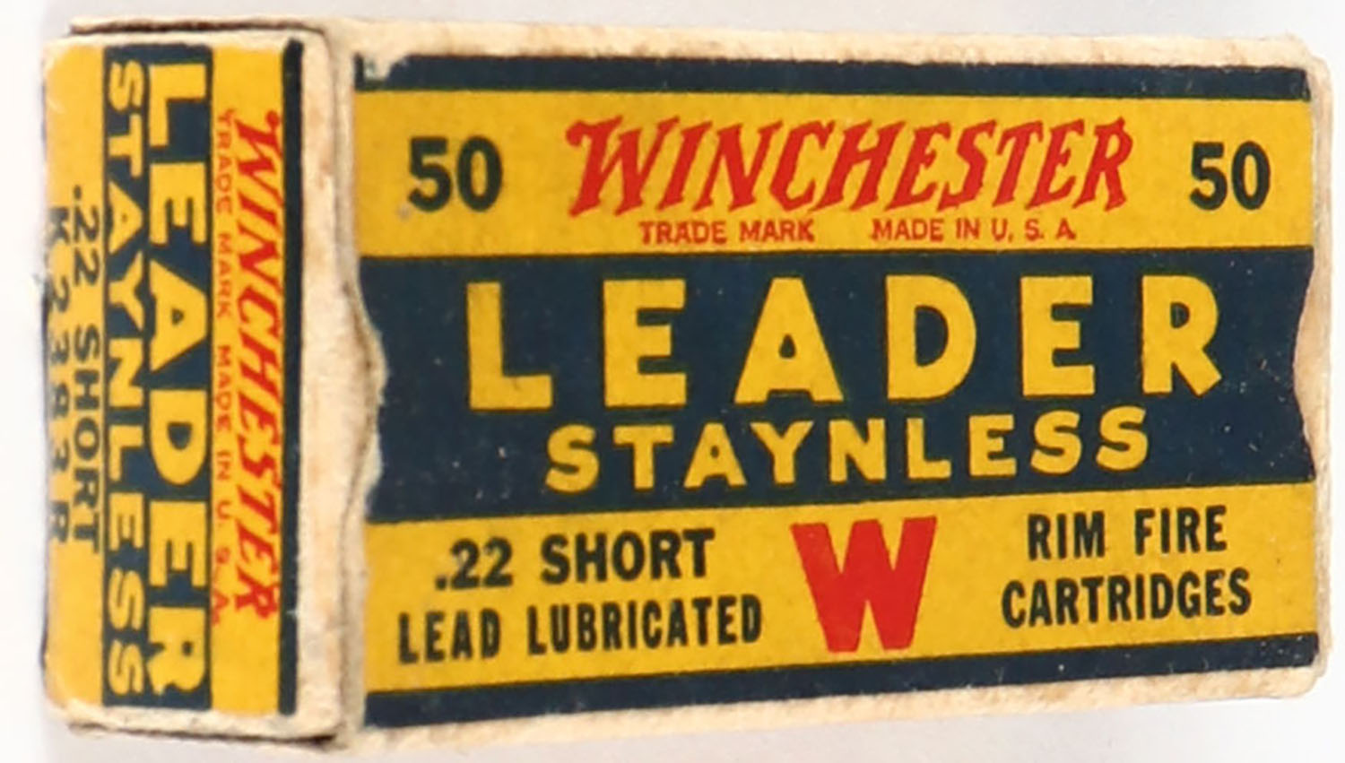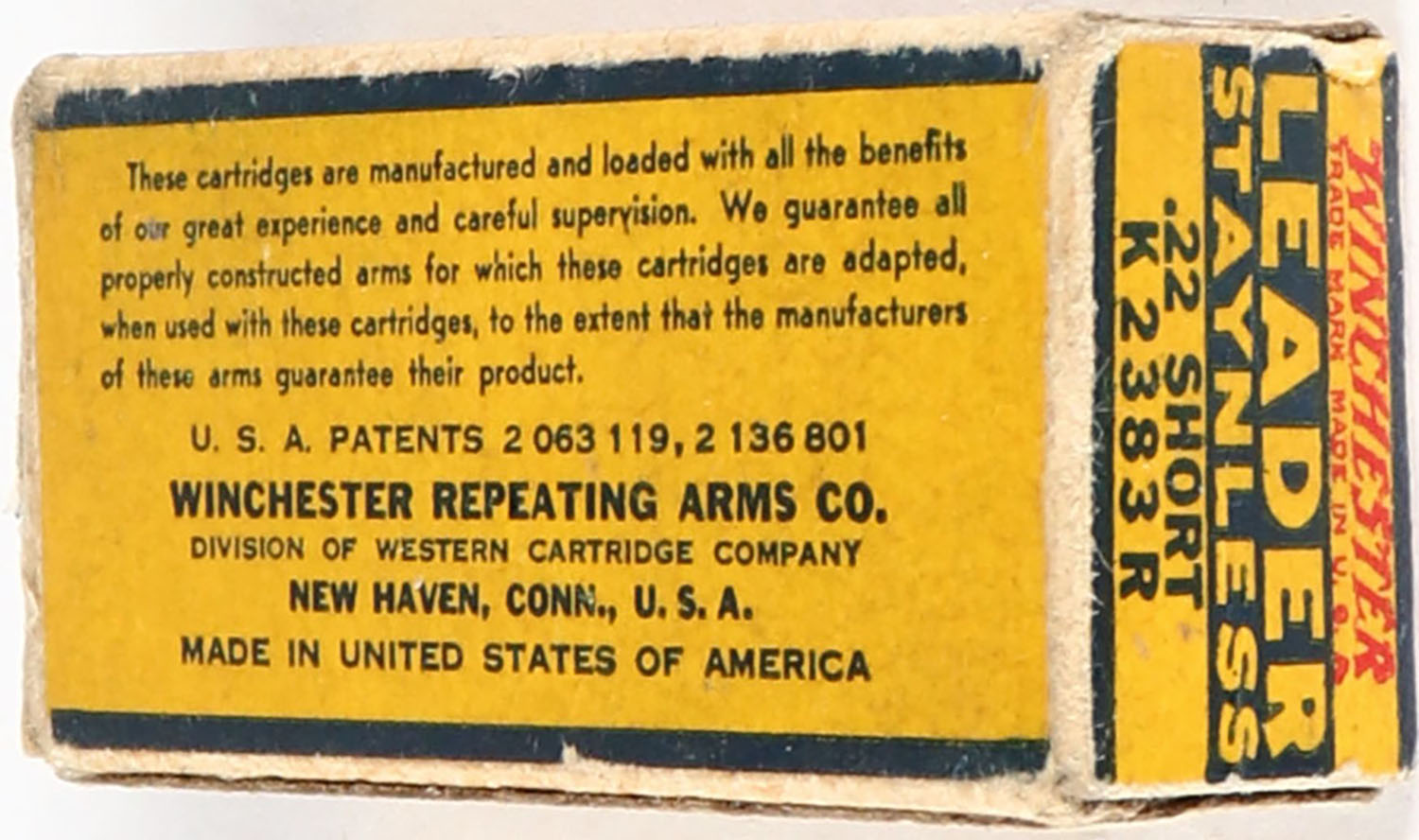 Winchester, Leader Staynless, .22 Short, RHWeb: WRA-55 S-1b, Partial 40rds. 1pc. Yellow blue & red box, box is solid with very good to excellent color, minor age soiling & edge wear, some corner wear, end flaps are solid, ammo is very good to excellent. Grade: Very Good + - Value: 10 to 50