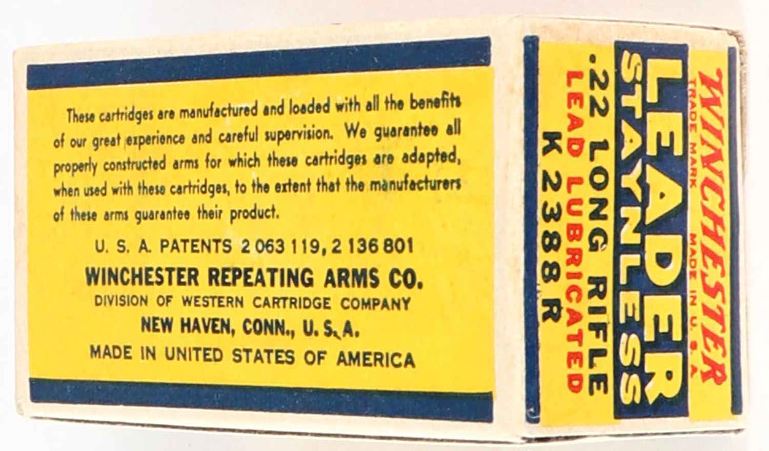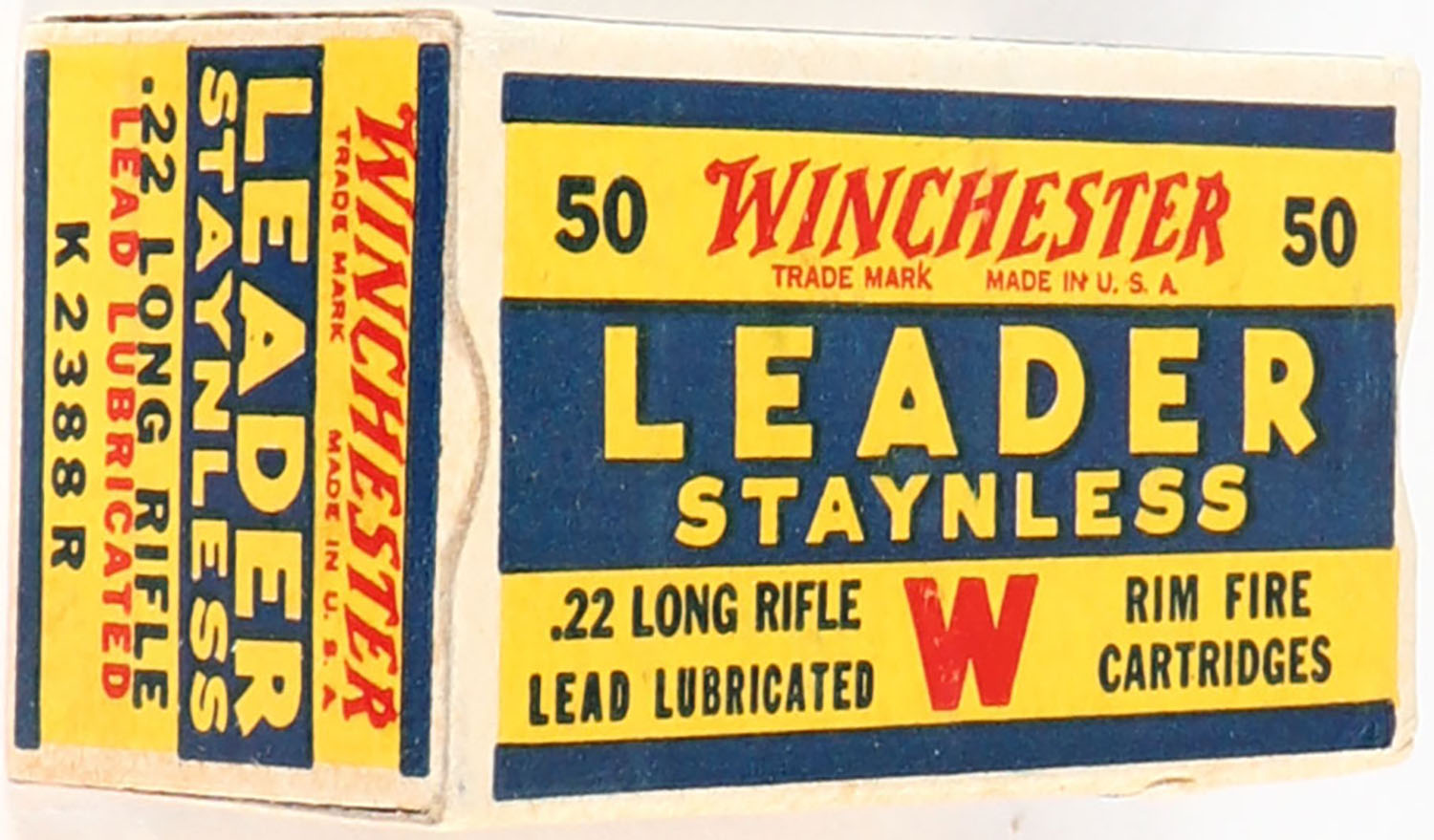 Winchester, Leader Staynless, .22 Long Rifle, RHWeb: WRA-55 LR-1c, Full, 1pc. Yellow blue & red box, box is solid with excellent color, very minor age soiling & corner wear, edges are mostly crisp, end flaps are solid, ammo is very good. Grade: Excellent + - Value: 8 to 40