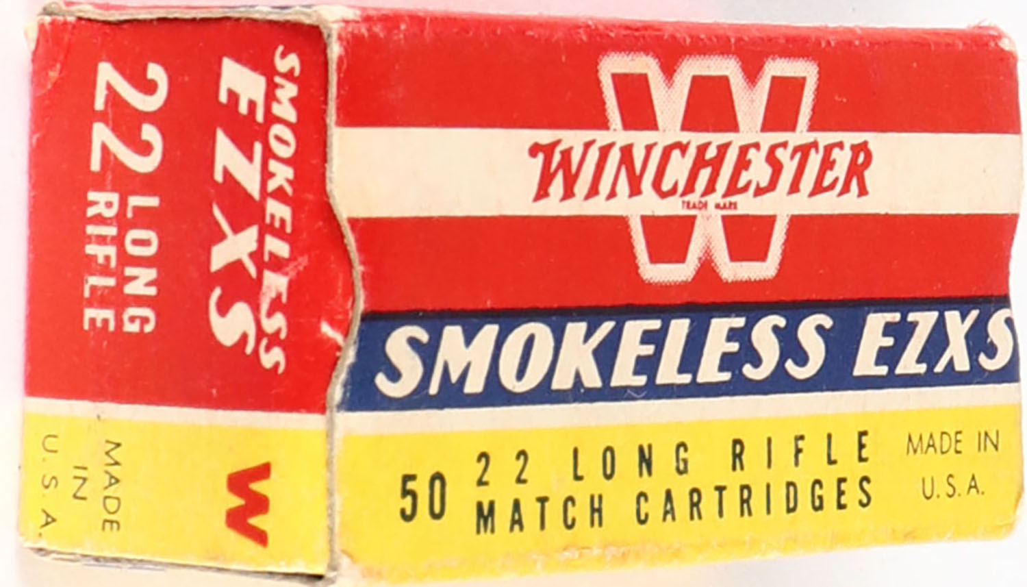 Winchester, Smokeless EZXS, .22 Long Rifle, Match Cartridges, RHWeb: WRA-54 LR-7a, Full, 1pc. Red yellow & blue box, box is solid with excellent color, minor corner wear, very minor edge wear, end flaps are solid, ammo is very good to excellent. Grade: Excellent - Value: 10 to 50