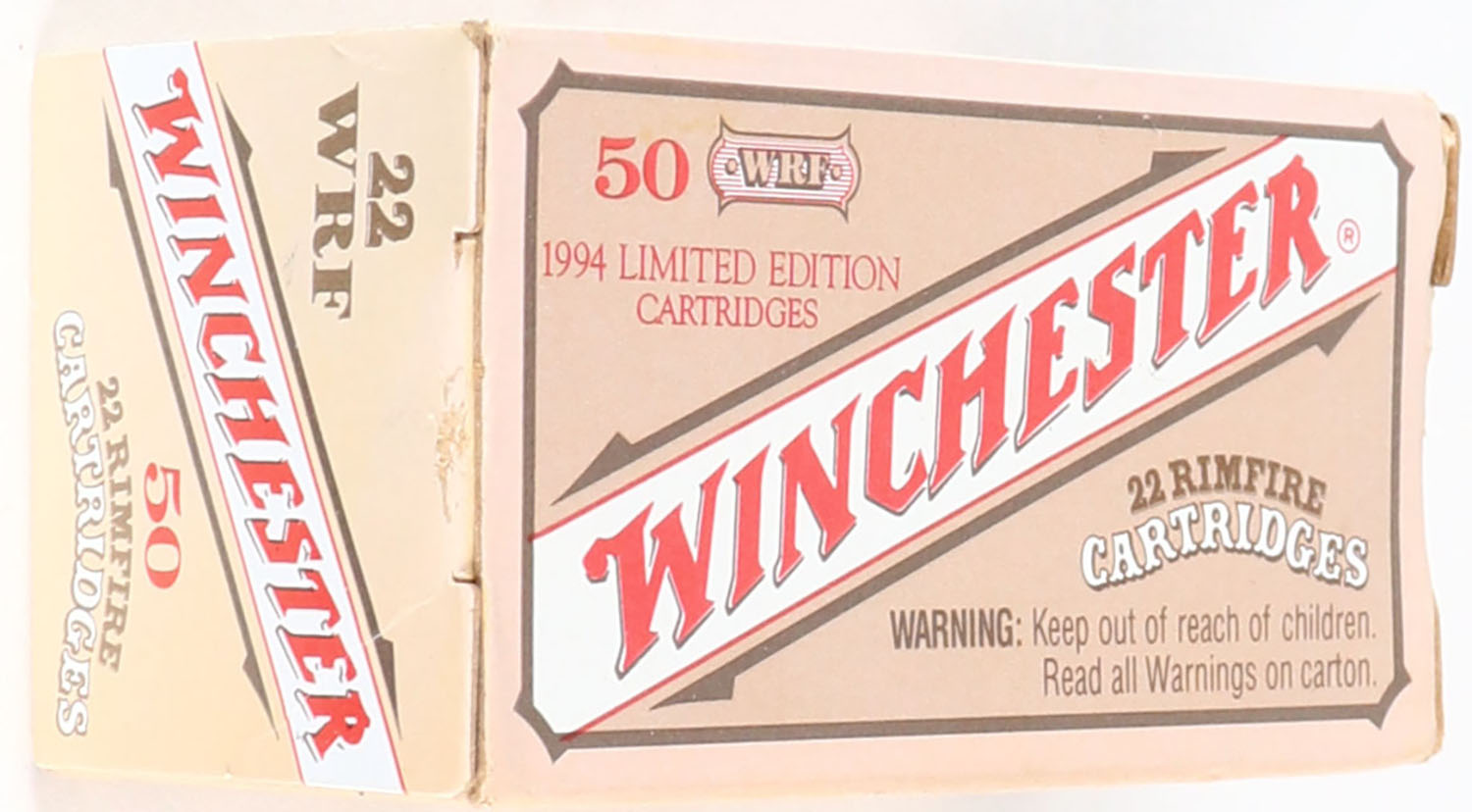 Winchester, 1994 Limited Edition Cartridges, .22 W.R.F., RHWeb: WRA-H&R-72, WRF-2, Full, 1pc. Tan brown & red box, box is solid with very good color, color fading, very minor corner wear, edges are crisp, end flaps are solid, ammo is minty. Grade: Excellent - Value: 8 to 40