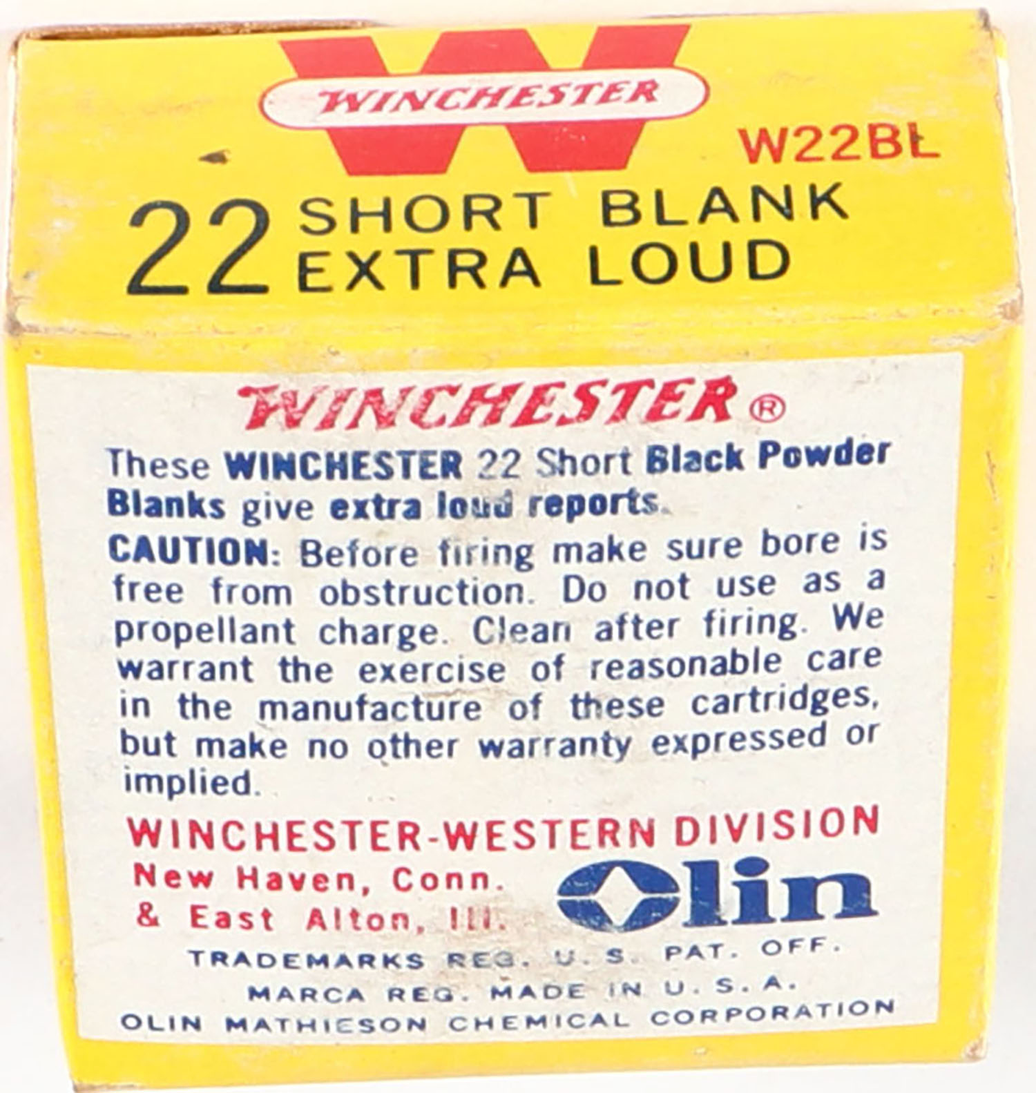 Winchester, Black Powder Blank Cartridges, .22 Short Blank, Extra Loud, RHWeb: WRA-20 S-1a, Full, 1pc. Yellow red & white box, box is solid with excellent color, top has been written on, corners are sharp, edges are crisp, flaps are solid, ammo is excellent. Grade: Very Good + - Value: 8 to 40