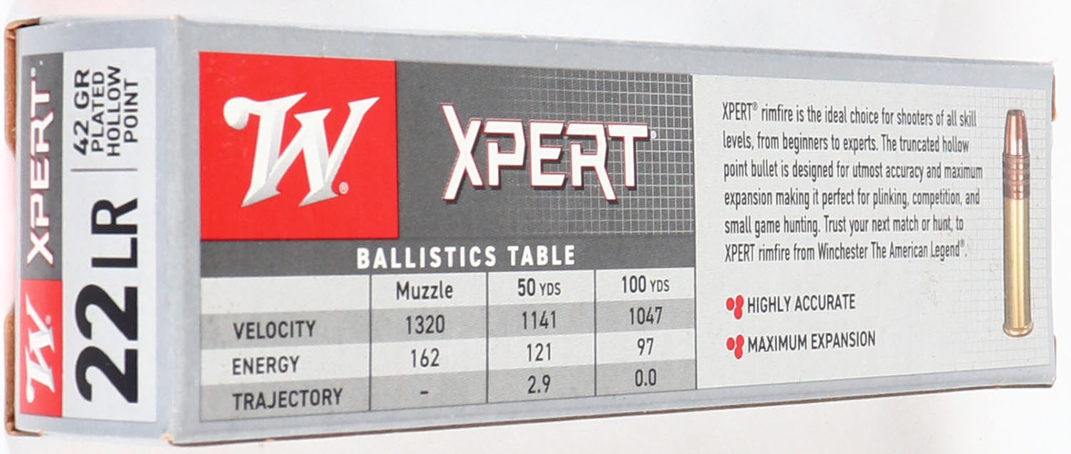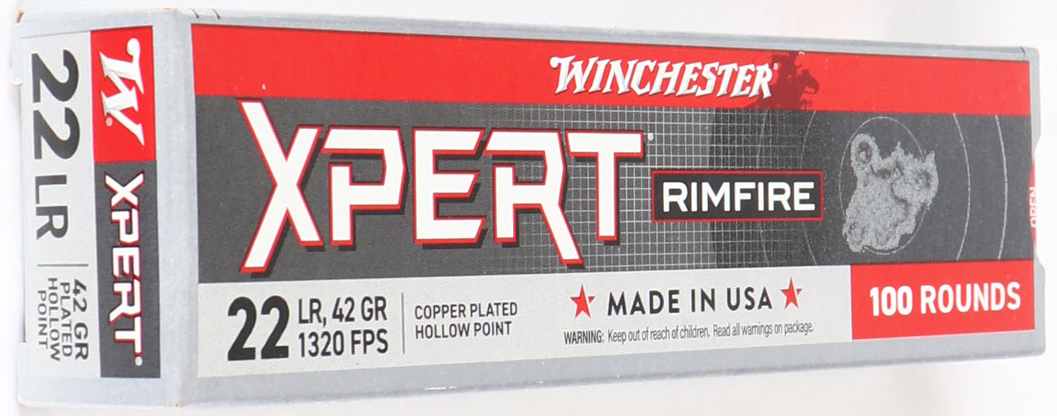 Winchester, Xpert, .22 Long Rifle, 42 Grain Copper Plated Hollow Point, 1320 FPS, Full, 100rds., 1pc. Gray red & white box, box is MINT with minty color, corners are sharp, edges are crisp, end flaps are solid, ammo is mint. Grade: MINT - Value: 12 to 36