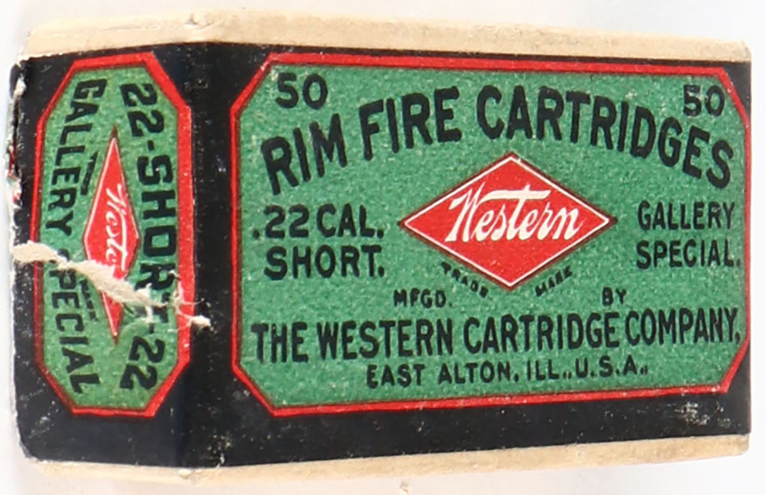 Western, Rim Fire Cartridges, .22 Short, Gallery Special, RHWeb: WCC-48 S-3.2, Full, 1pc. Buff box with green black & red wraparound label, box is solid with excellent color, very minor shelf & corner wear, edges are crisp, label is intact, ammo is fair to good. Grade: Excellent + - Value: 100 to 400