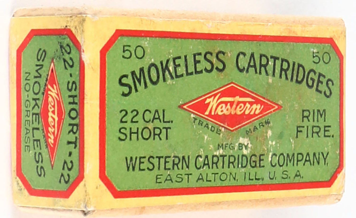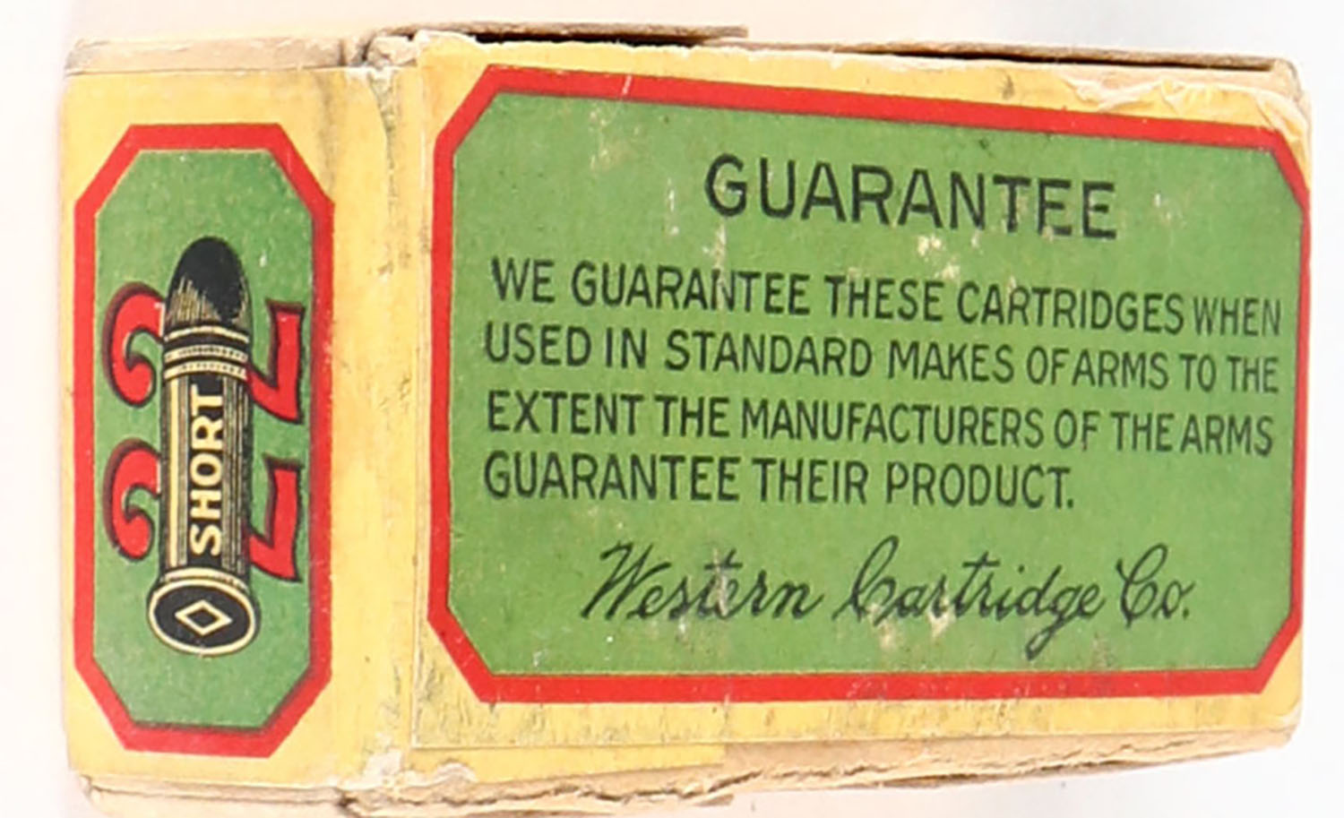 Western, Smokeless Cartridges, .22 Short, RHWeb: WCC-3 S-5.1, FULL & SEALED, 2pc. Buff box with green red & yellow wraparound label, box is solid with excellent color, minor shelf & corner wear, edges are crisp, label is intact. Grade: Excellent + - Value: 50 to 200