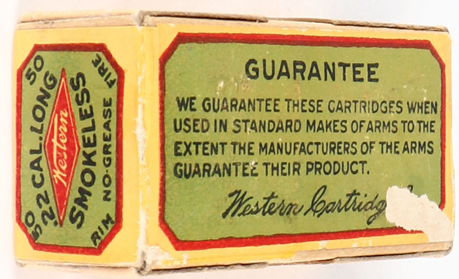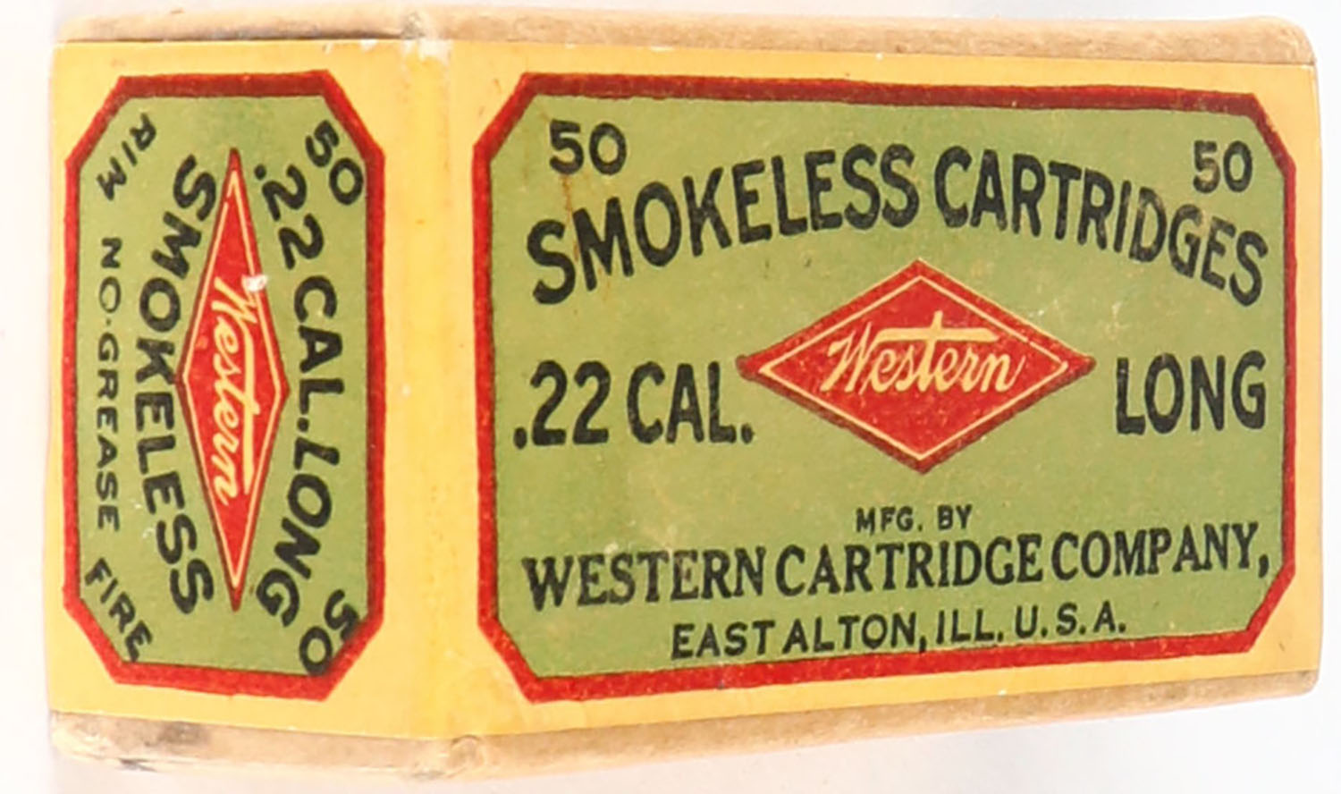 Western, Smokeless Cartridges, .22 Long, No-Grease, RHWeb: WCC-3 L-10, FULL & SEALED, 2pc. Buff box with green yellow & red wraparound label, box is solid with excellent color, only very minor color fading, very minor shelf wear on bottom, very minor corner wear, edges are mostly crisp, label is intact. Grade: Excellent + - Value: 50 to 150