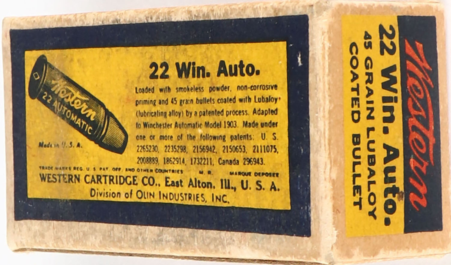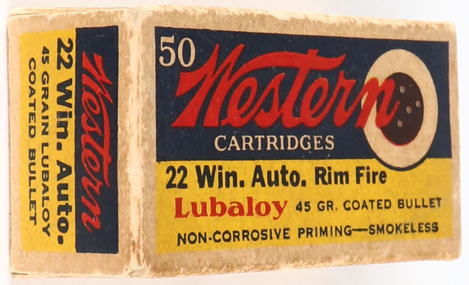 Western, Lubaloy, .22 Win. Auto., RHWeb: WCC-5 WA-3a, Full, 1pc. Yellow blue & red bulls eye box, box is solid with very good color, some age soiling, minor edge & corner wear, end flaps are solid, ammo is excellent. Grade: Very Good + - Value: 30 to 90