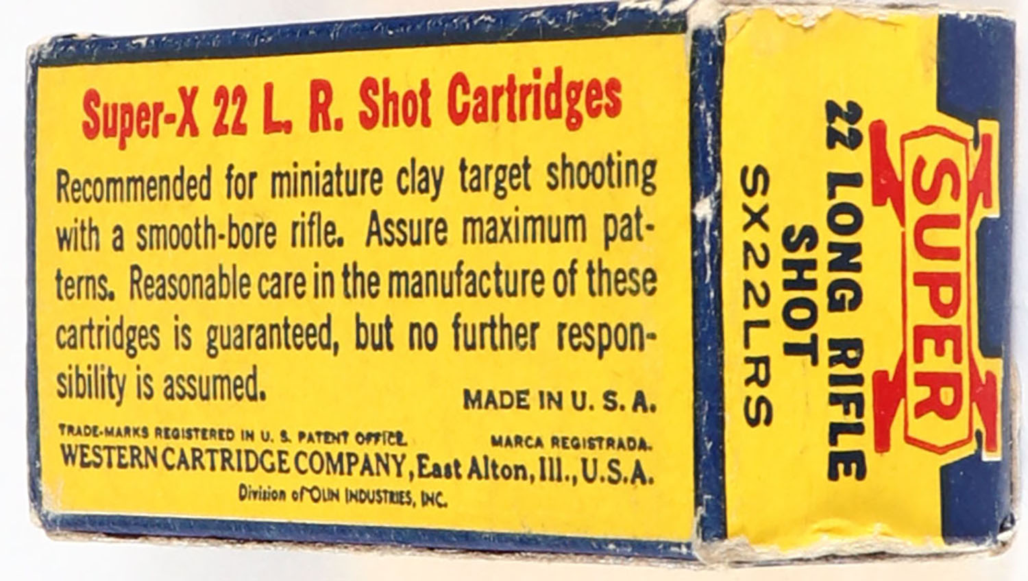 Western, Super-X, .22 Long Rifle Shot, Extra Clean Wax Coated, RHWeb: Super-X-Long Rifle-40 LRS-20, Full, 1pc. Yellow blue & red box, box is solid with excellent color, some edge & corner wear, end flaps are solid, ammo is excellent. Grade: Excellent - Value: 20 to 80