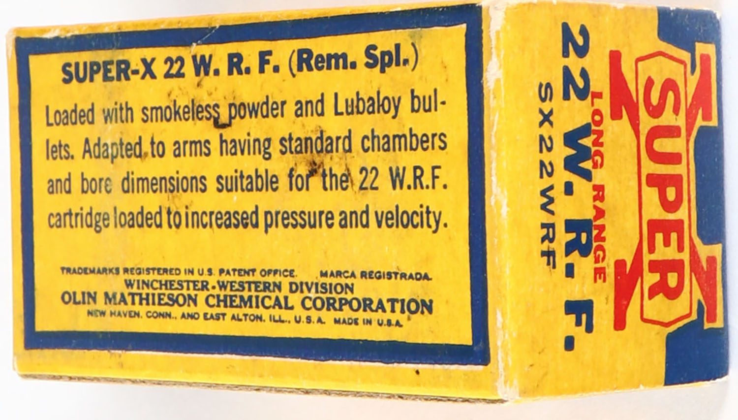 Western, Super-X, .22 W.R.F. (Rem. Spl.), Long Range, RHWeb: Super-X-WRF-14 WRF-21, Full, 1pc. Yellow blue & red box, box is solid with excellent color, minor age soiling & corner wear, edges are crisp, end flaps are solid, ammo is excellent. Grade: Excellent - Value: 12 to 48