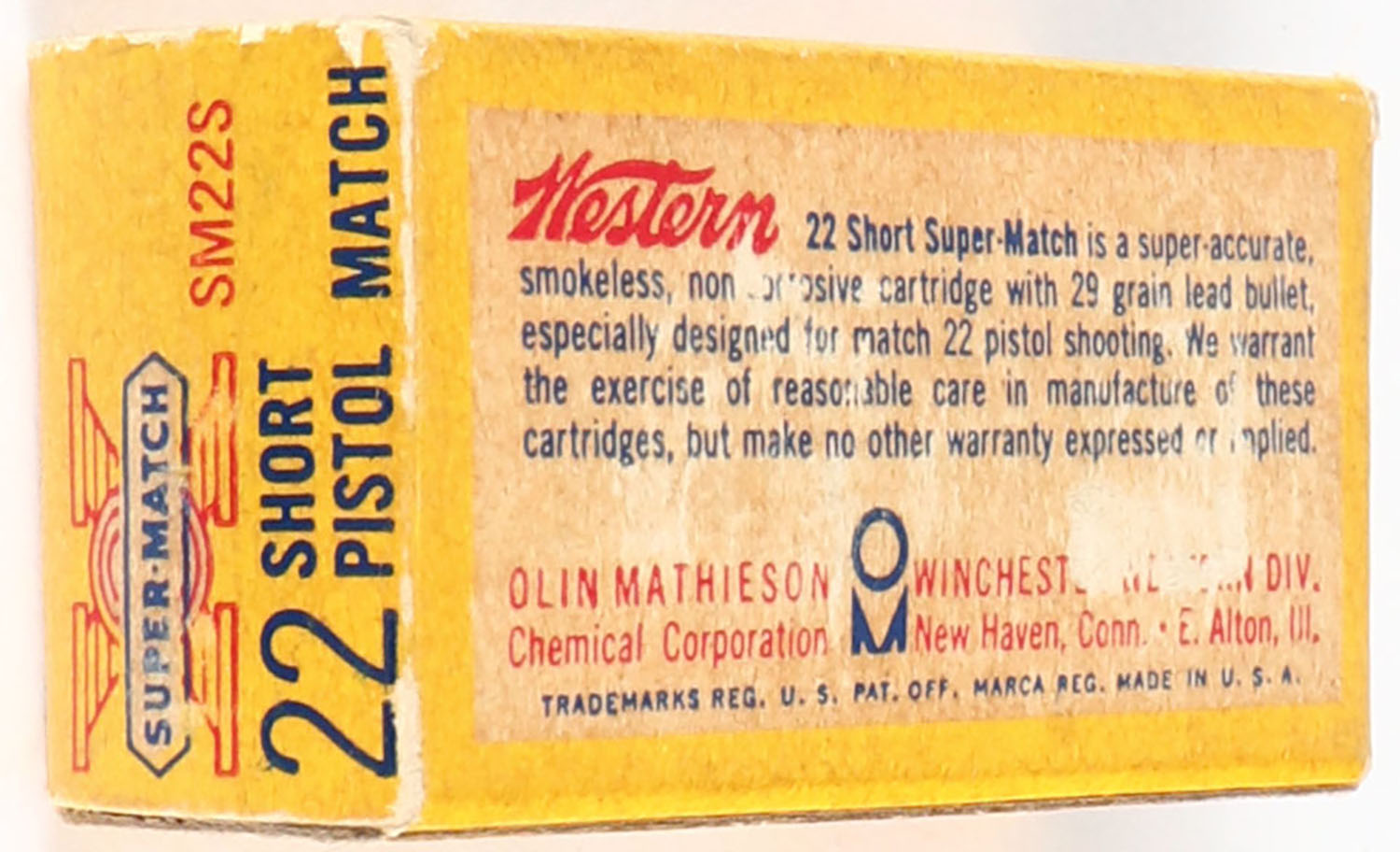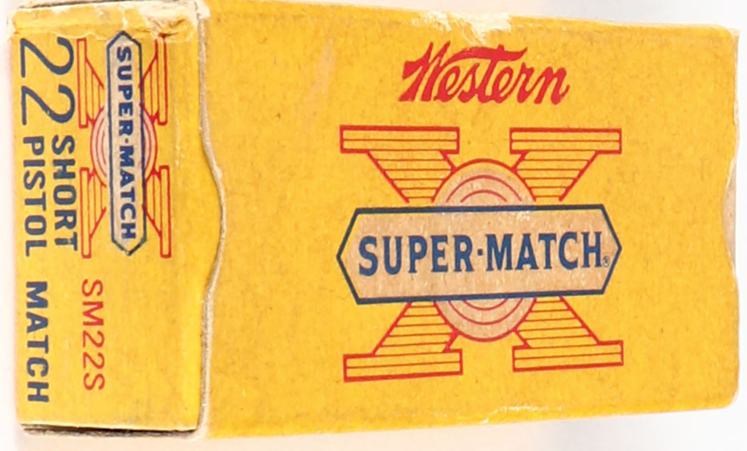 Western, Super-Match, .22 Short, Pistol Match, RHWeb: WCC-51.5 S-1, Full, 1pc. Yellow red & white box, box is solid with good color, age soiling, minor corner wear, edges are mostly crisp, end flaps are solid, ammo is excellent. Grade: Very Good + - Value: 10 to 40