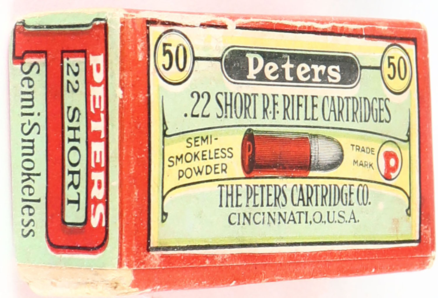 Peters, R.F. Rifle Cartridges, .22 Short, Semi- Smokeless Powder, RHWeb: PCC-5A S-1b, FULL & SEALED, 2pc. Buff box with red green & yellow full wraparound label, box is solid with very good color, some age soiling & color fading, some shelf & corner wear, edges are mostly crisp, label is intact. Grade: Excellent - Value: 40 to 200