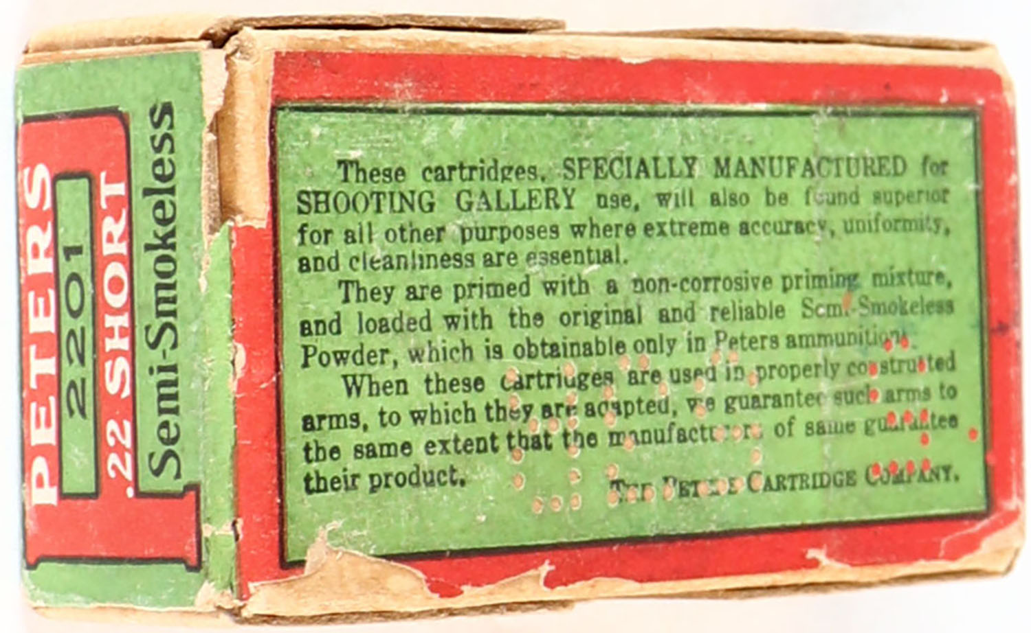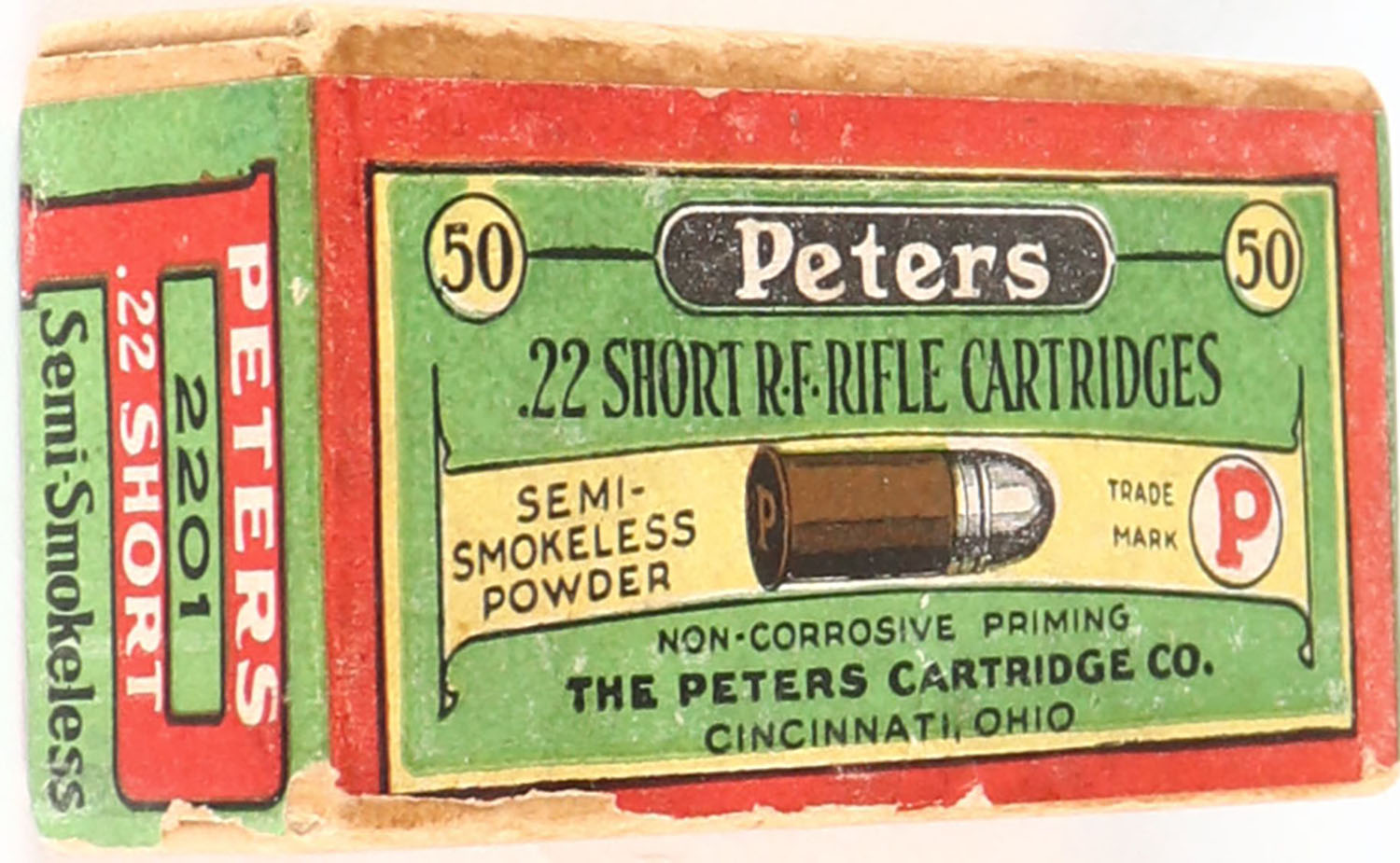 Peters, R.F. Rifle Cartridges, .22 Short, Semi-Smokeless Powder, RHWeb: PCC-5B S-1c, FULL & SEALED, 2pc. Buff box with multi-colored wraparound label, box is solid with very good to excellent color, very minor color fading, corners are sharp, edges are crisp, label is intact. Grade: Excellent - Value: 40 to 120