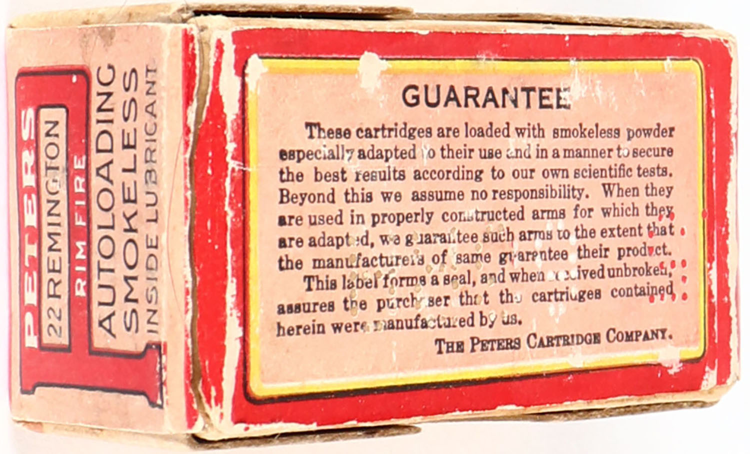 Peters, Smokeless R.F. Cartridges, .22 Remington Autoloading, RHWeb: PCC-5A RA-1, FULL & SEALED, 2pc. Buff box with salmon & red wraparound label, box is solid with excellent color, minor age soiling & shelf wear, minor edge & corner wear, front has been written on, label is intact. Grade: Excellent - Value: 150 to 450