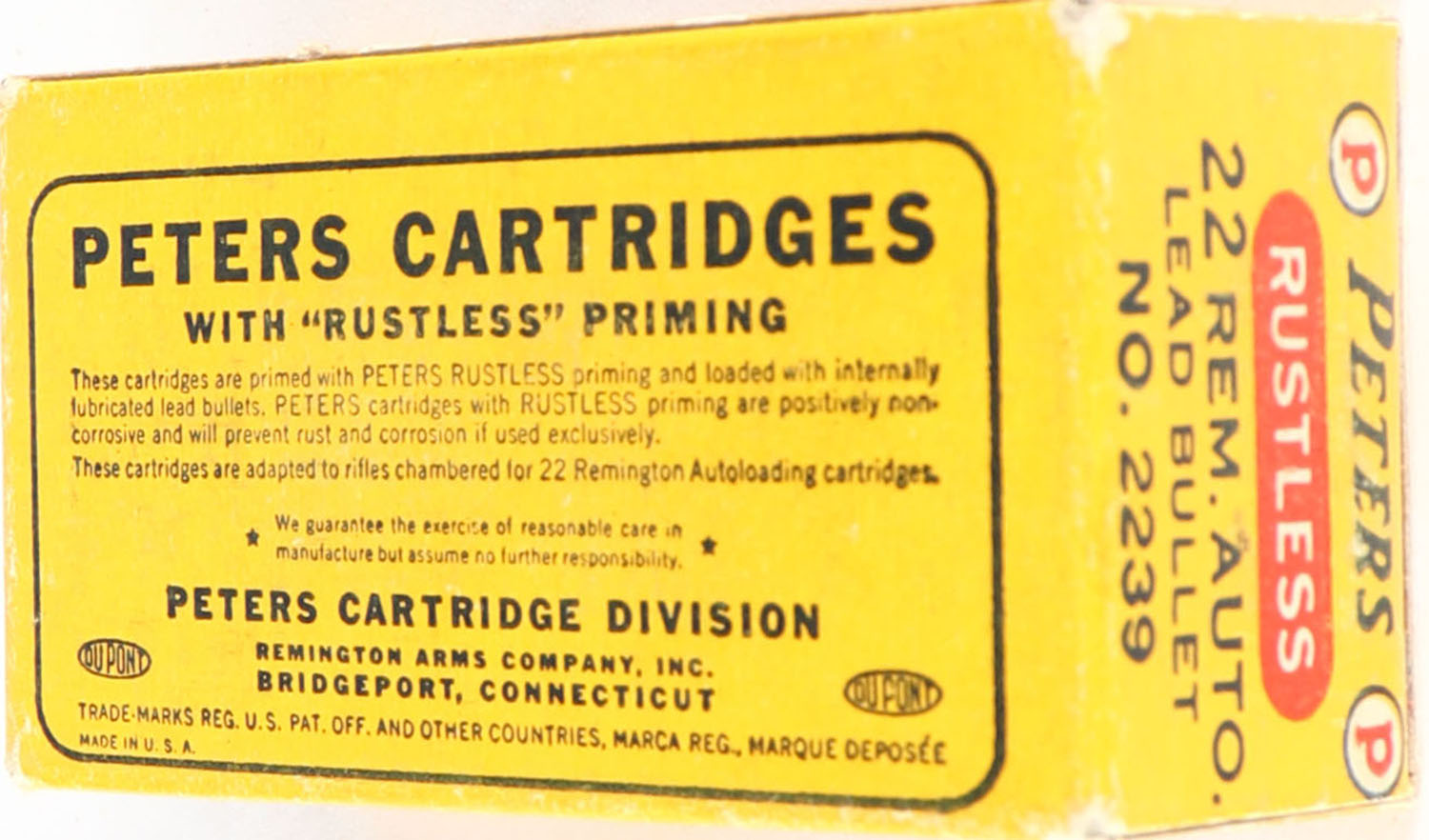 Peters, Rustless, .22 Remington Auto Loading, Bridgeport, RHWeb: PCC-8D RA-3.1, Full, 1pc. Blue yellow & red box, box is solid with excellent color, minor age soiling, very minor shelf & corner wear, edges are mostly crisp, ammo is excellent. Grade: Excellent - Value: 50 to 300
