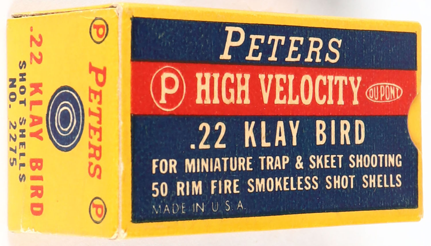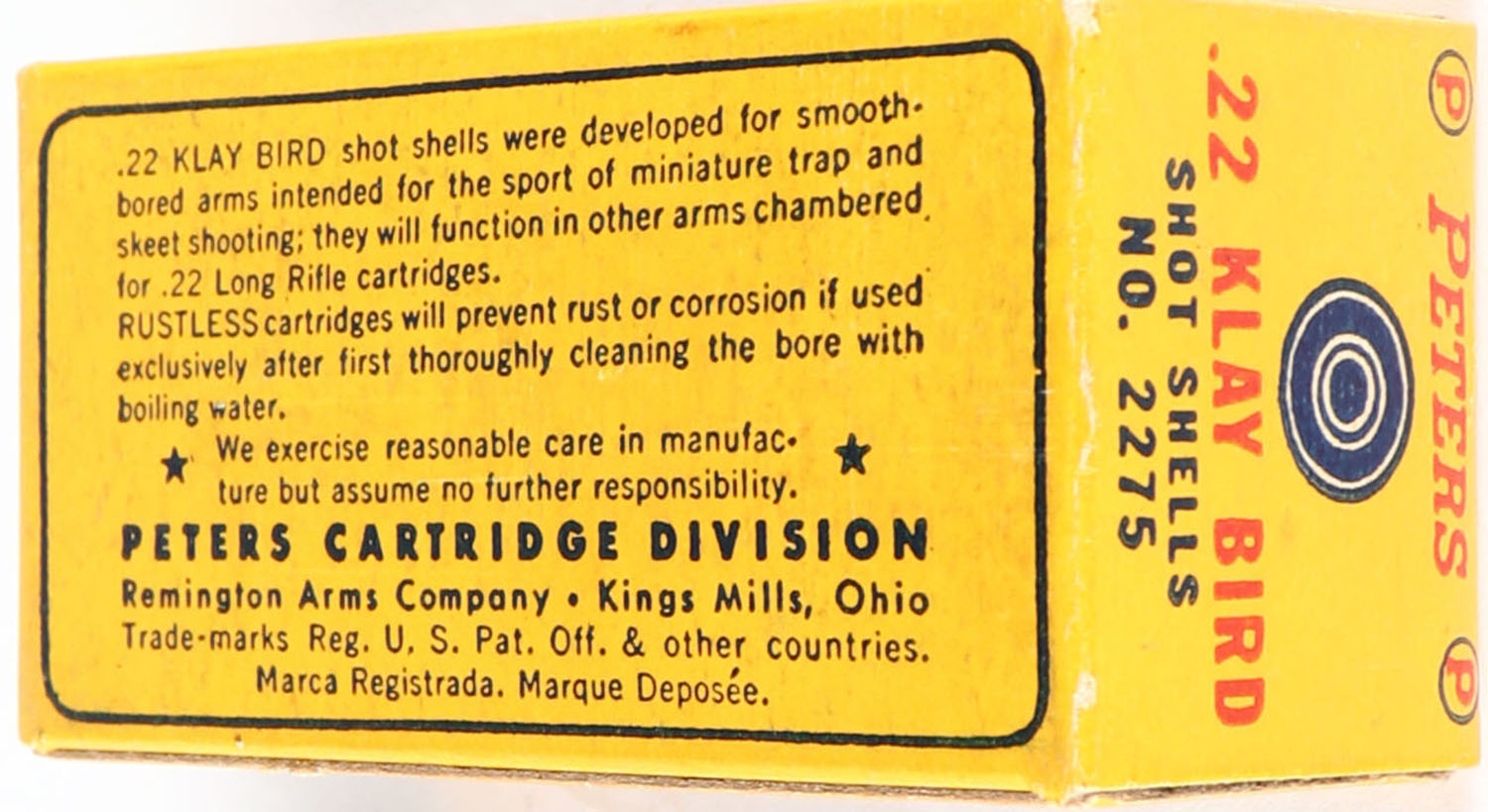 Peters, High Velocity Klay Bird, .22 Long Rifle Shot, Kings Mills, RHWeb: PCC-14 LR-4, Full, 1pc. Blue yellow & red box, box is solid with excellent color, very minor age soiling, corners are mostly sharp, edges are crisp, end flaps are solid, ammo is excellent. Grade: Excellent - Value: 120 to 480