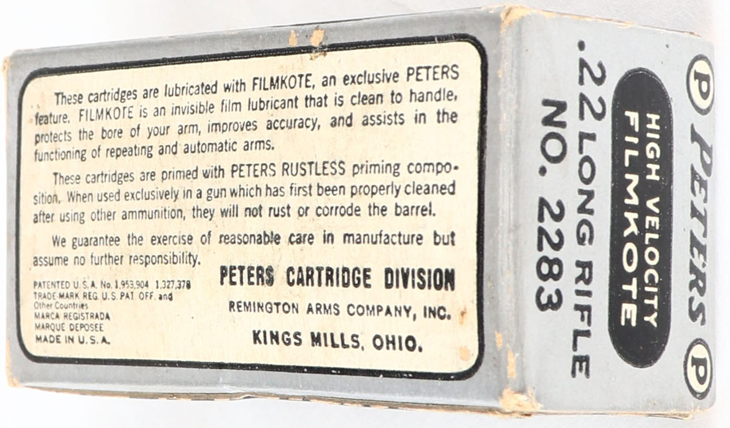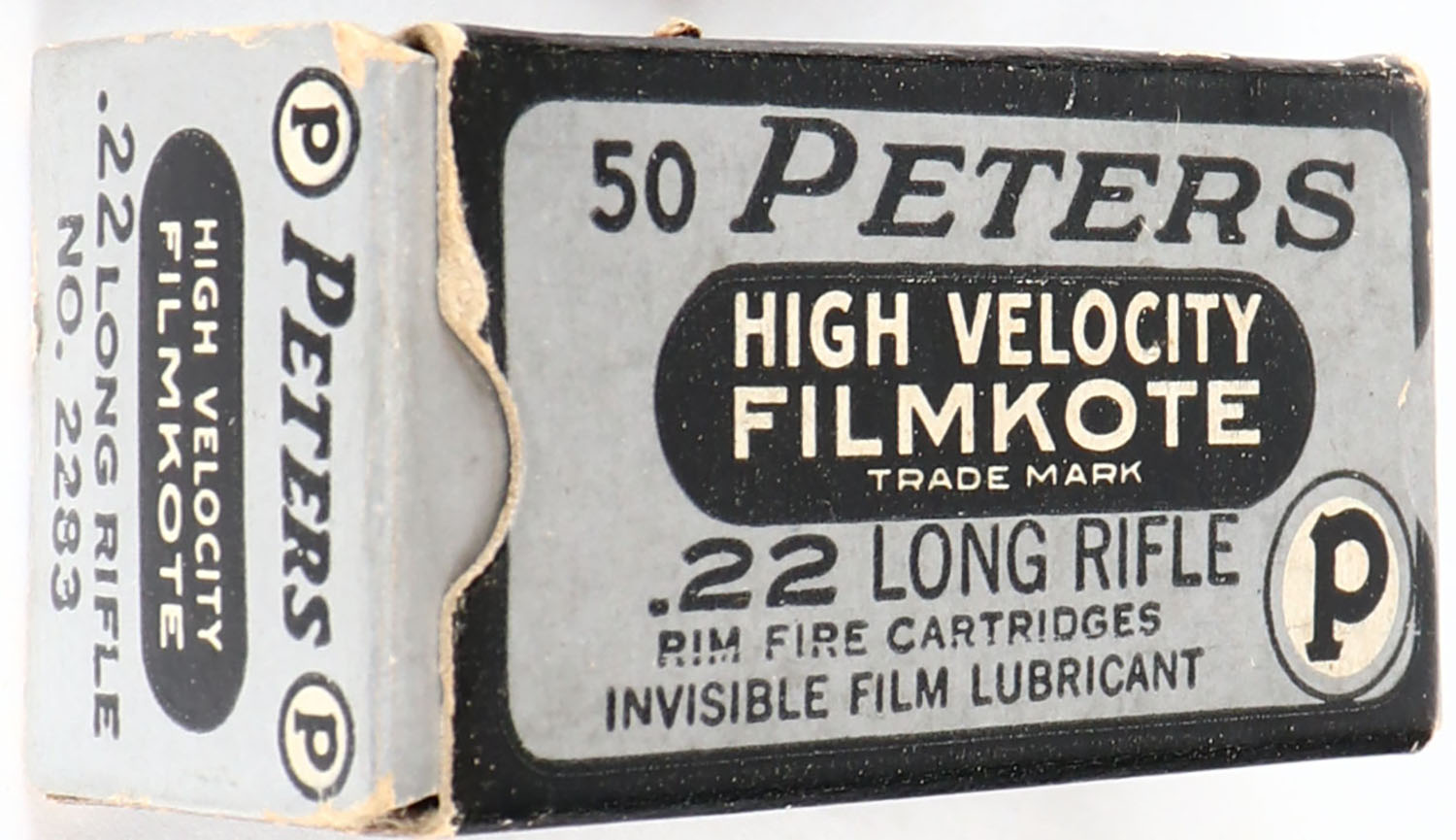 Peters, High Velocity Filmkote, .22 Long Rifle, RHWeb: PCC-13 LR-1g, Full, 1pc. Silver black & white box, box is solid with excellent color, minor age soiling, very minor corner wear, edges are crisp, end flaps are solid, ammo is excellent. Grade: Excellent - Value: 10 to 40