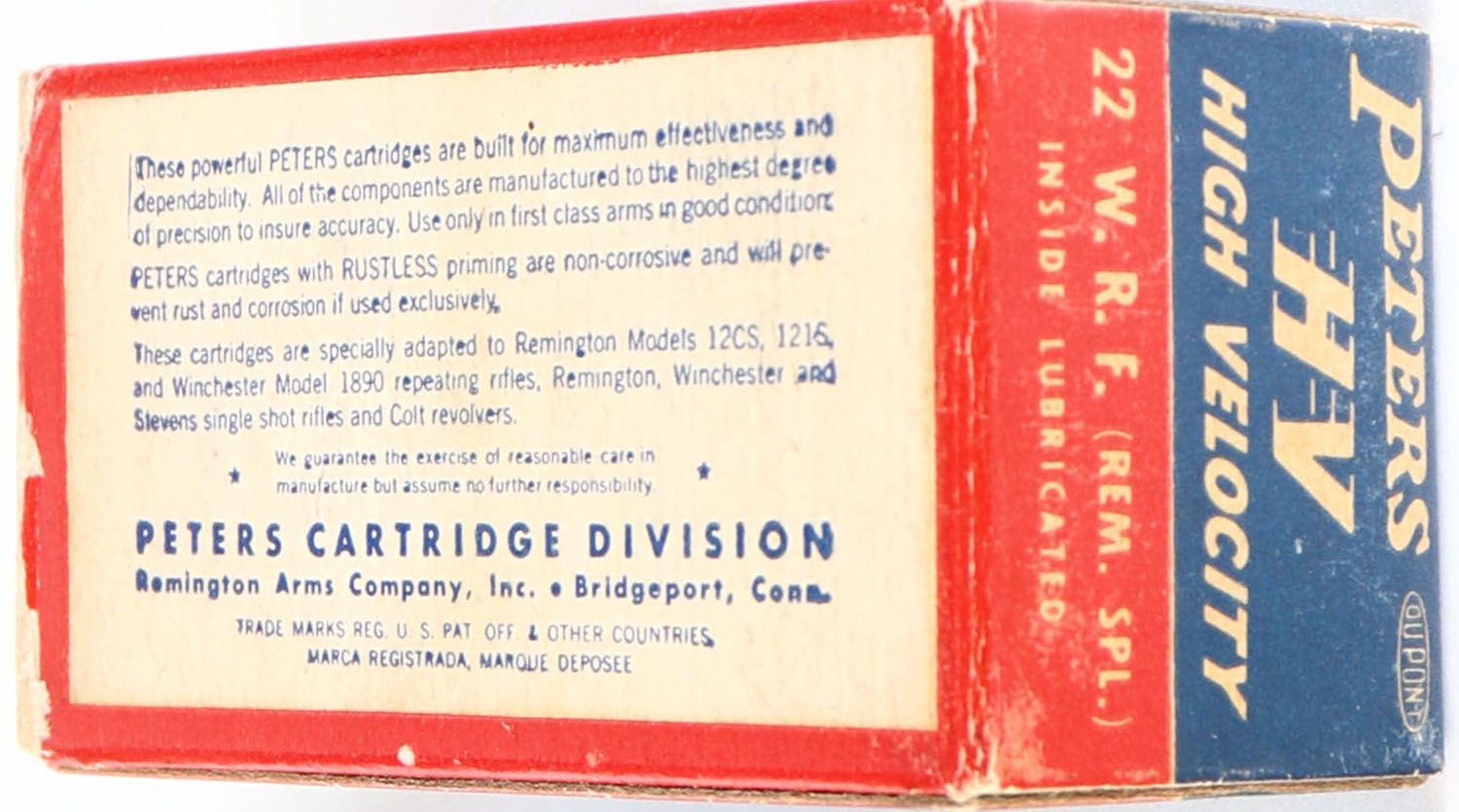 Peters, High Velocity, .22 W.R.F. (Rem. Spl.), RHWeb: PCC-17 WRF-1d, Full, 1pc. Blue red & white box, box is solid with excellent color, very minor age soiling & corner wear, edges are crisp, end flaps are solid, ammo is excellent. Grade: Excellent + - Value: 16 to 60