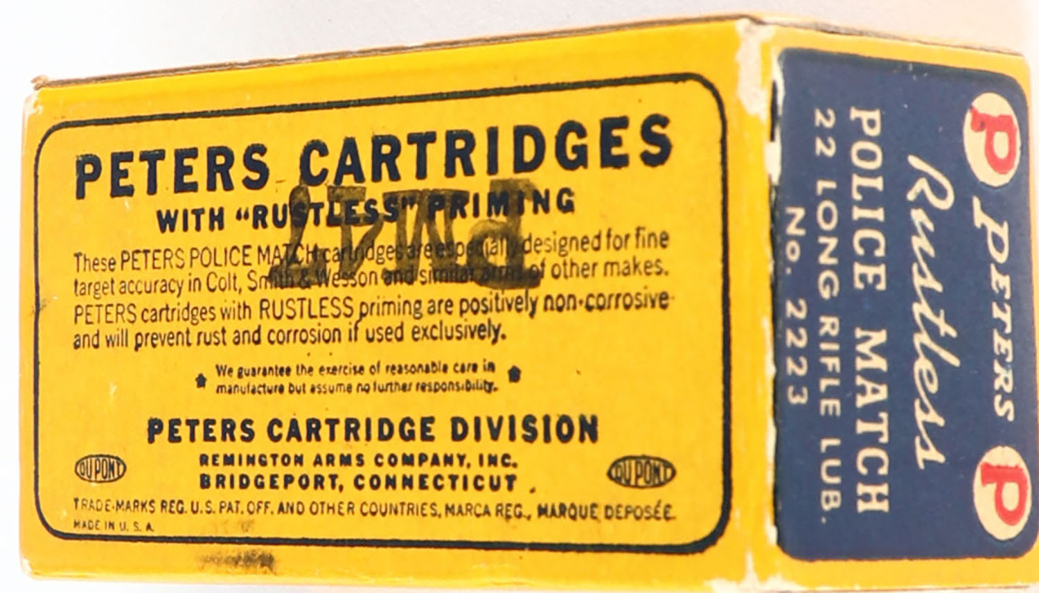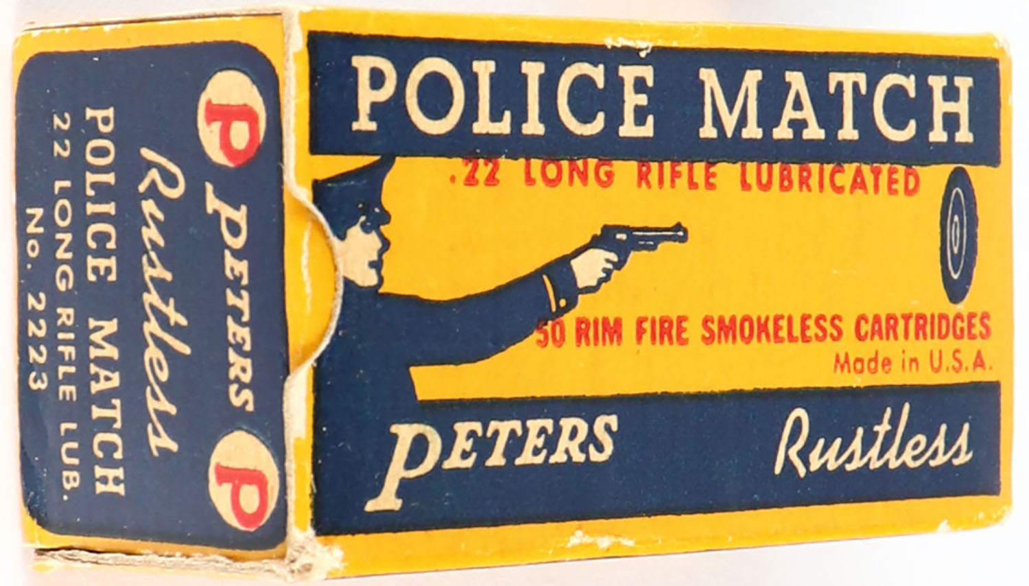 Peters, Police Match, .22 Long Rifle, RHWeb: PCC-53C LR-1b, Full, 1pc. Yellow blue & white box, box is solid with excellent color, very minor corner wear, edges are mostly crisp, end flaps are solid, ammo is excellent. Grade: Excellent + - Value: 40 to 120
