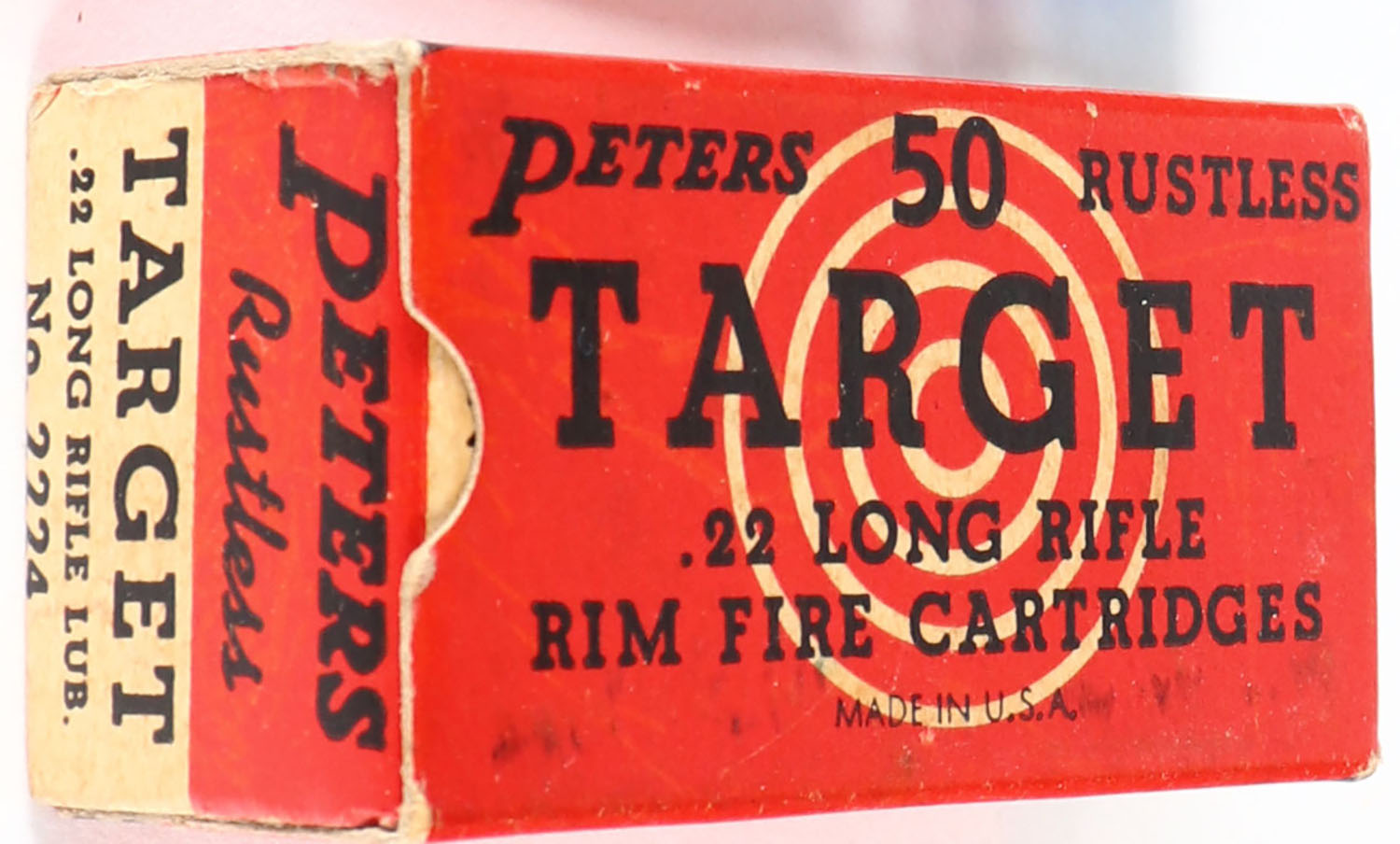 Peters, Target, .22 Long Rifle, RHWeb: PCC-54A LR-1a, Full, 1pc. Red black & white box, box is solid with excellent color, minor age soiling, very minor corner wear, edges are crisp, end flaps are solid, ammo is excellent. Grade: Excellent + - Value: 10 to 50