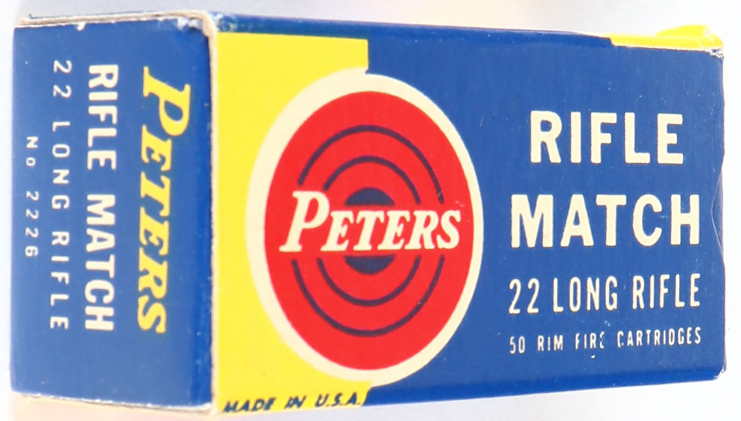 Peters, Rifle Match, .22 Long Rifle, RHWeb: PCC-55 LR-4.5, Full, 1pc. Blue yellow & red box, box is near mint with minty color, only very minor corner wear, edges are crisp, end flaps are solid, ammo is excellent to minty. Grade: Excellent + - Value: 30 to 90