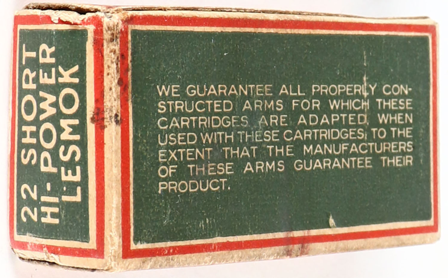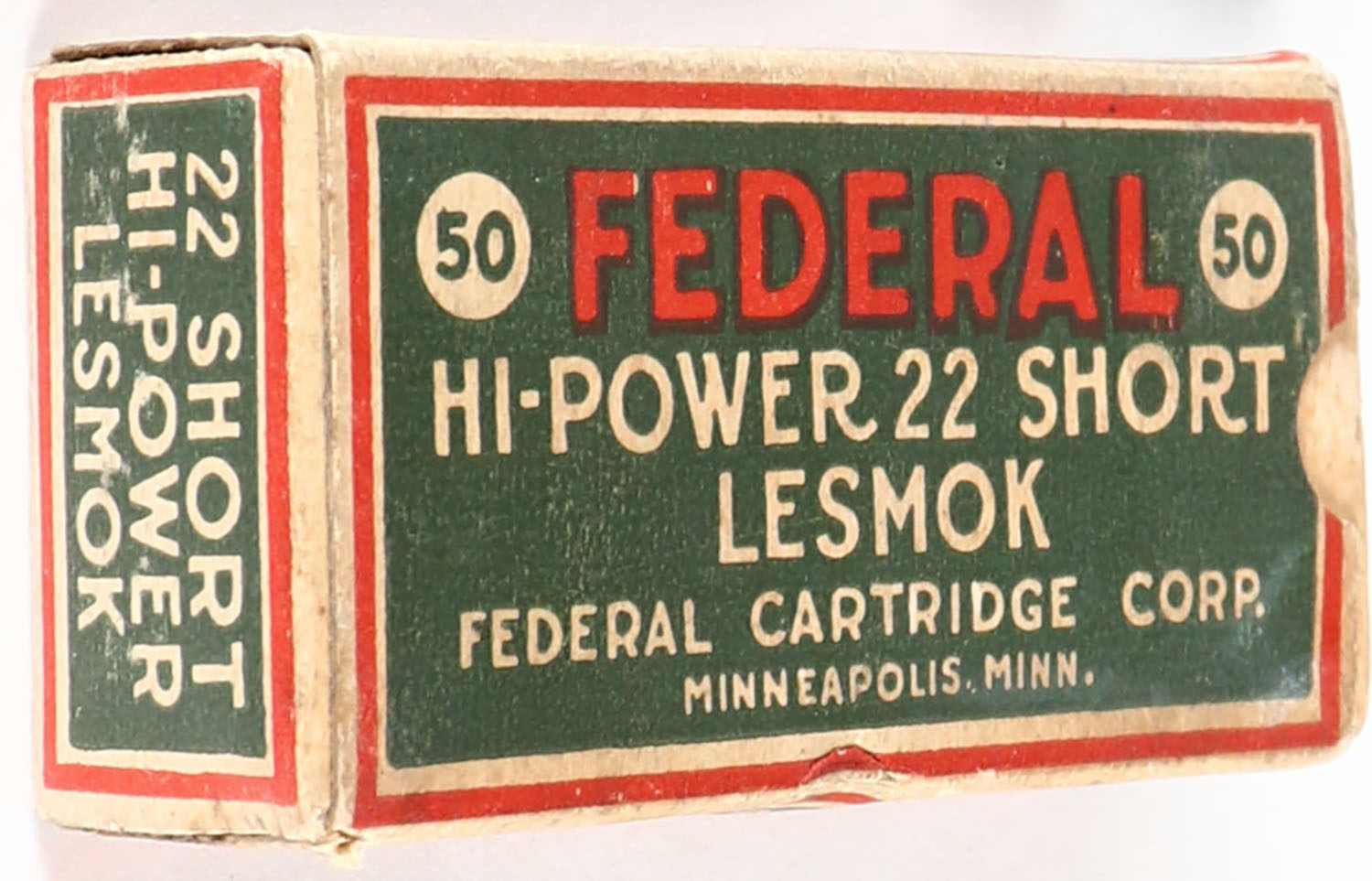 Federal, Hi-Power, .22 Short, Lesmok, RHWeb: FCC-1 S-1, Full, 1pc. Dark blue white & red box, box is solid with excellent color, age soiling, very minor edge & corner wear, edges are mostly crisp, end flaps are solid, ammo is very good. Grade: Excellent - Value: 200 to 600