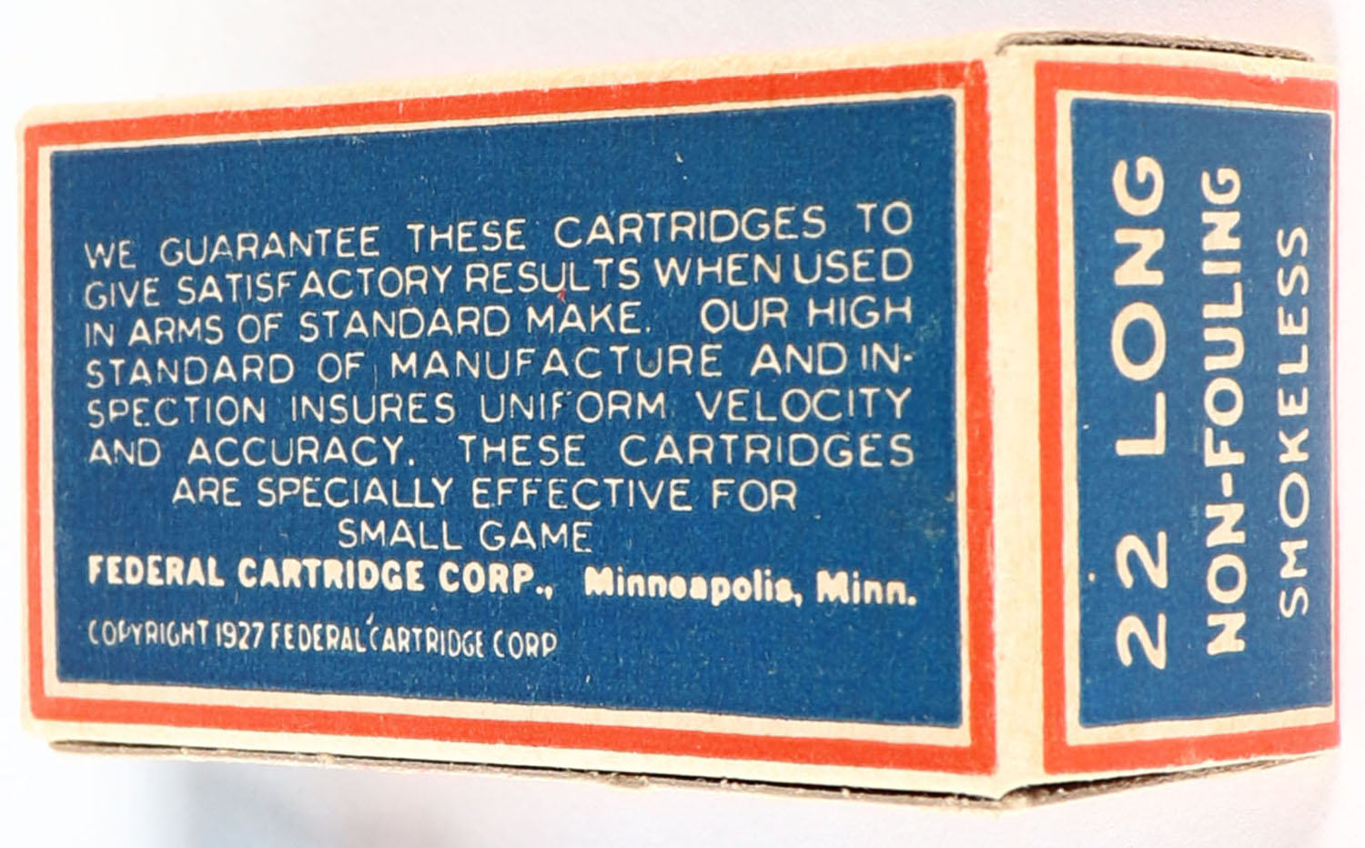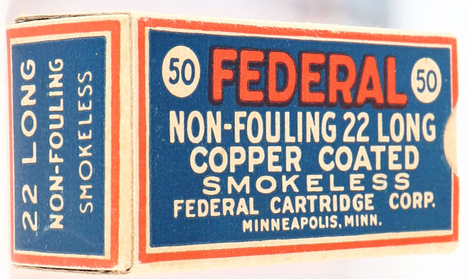Federal, Non-Fouling Copper Coated, .22 Long, Smokeless, RHWeb: FCC-3 L-2e, Full, 1pc. Blue red & buff box, box is MINT with minty color, corners are sharp, edges are crisp, end flaps are solid, ammo is excellent to minty. Grade: MINT - Value: 100 to 400