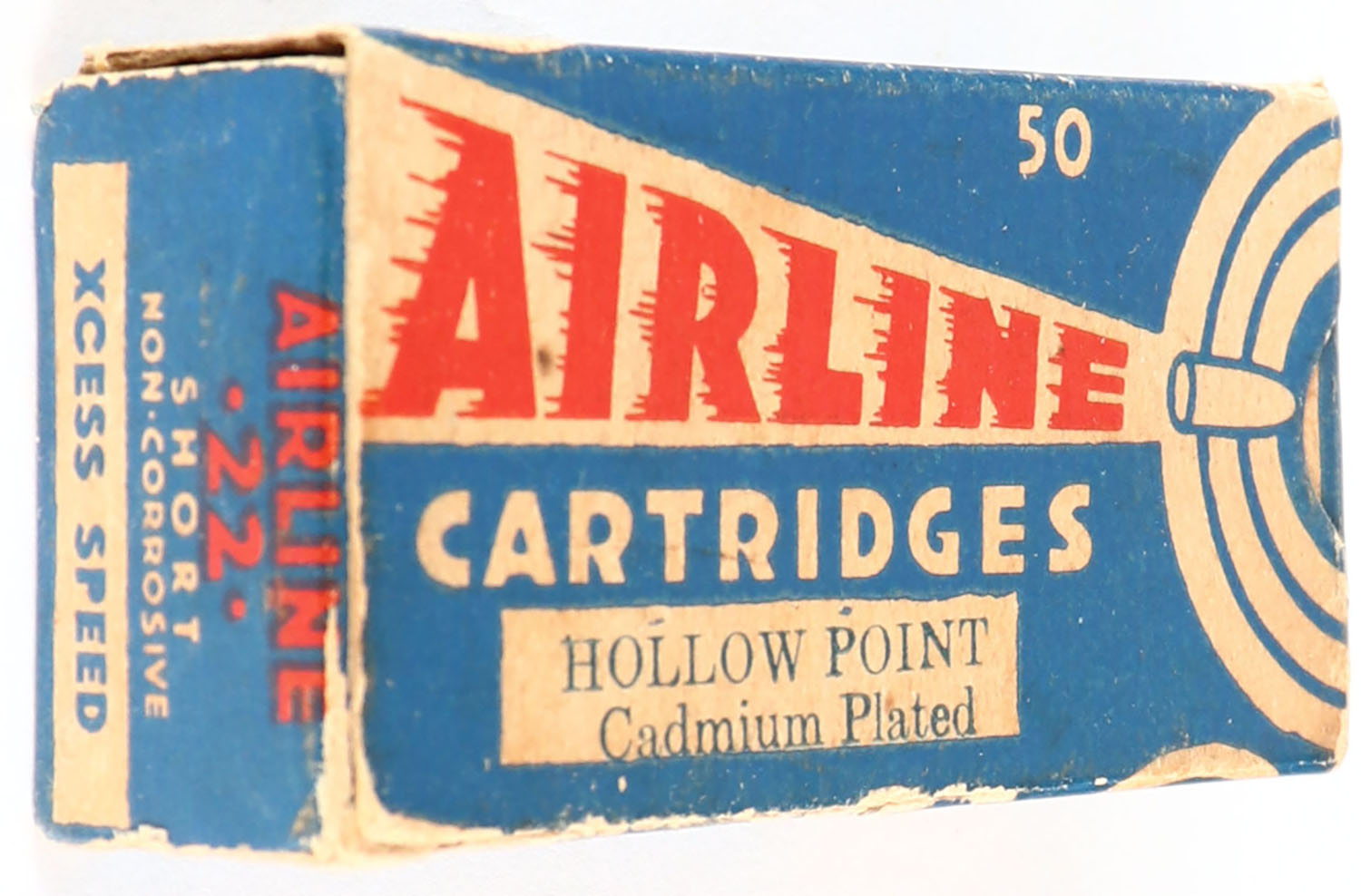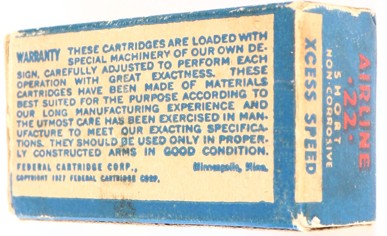Federal, Airline Cartridges, Cadmium Plated, .22 Short Hollow Point, Not in RHWeb, Partial 45rds. 1pc. Blue white & red box, left end flap is torn, partial seam split to top front edge, very good color, some age soiling, some edge & corner wear, right end flap is solid, ammo is excellent. Grade: Excellent - Value: 50 to 200