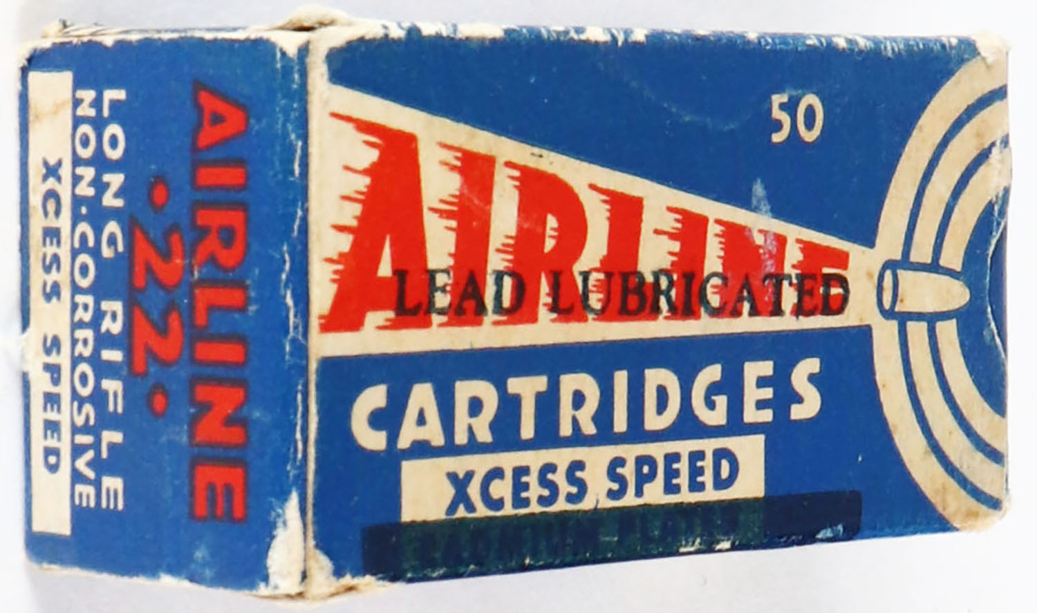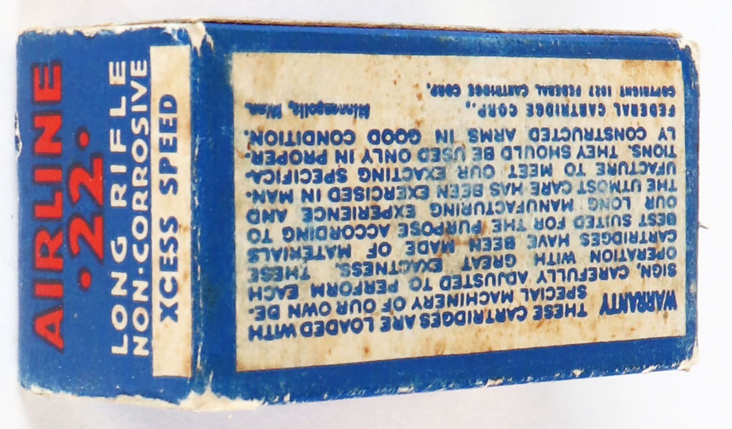 Federal, Airline, .22 Long Rifle, Xcess Speed Lead Lubricated, RHWeb: FCC-4.3 LR-8, Partial 48rds. 1pc. Blue white & red box, box is solid with very good to excellent color, minor age soiling, some corner wear, very minor edge wear, end flaps are solid, ammo is excellent. Grade: Very Good ++ - Value: 40 to 200