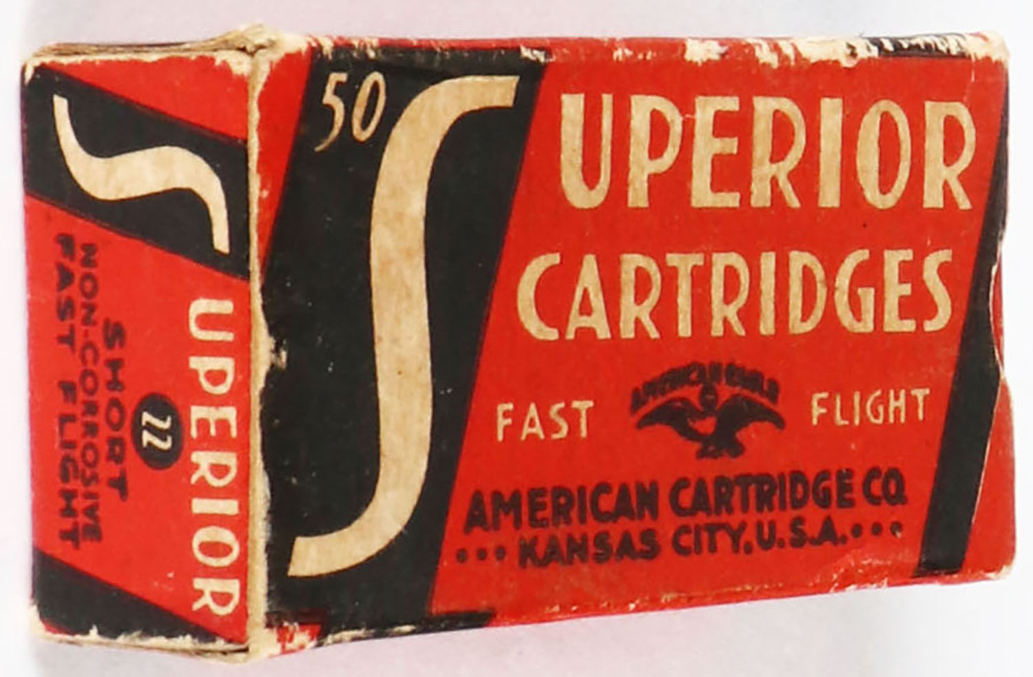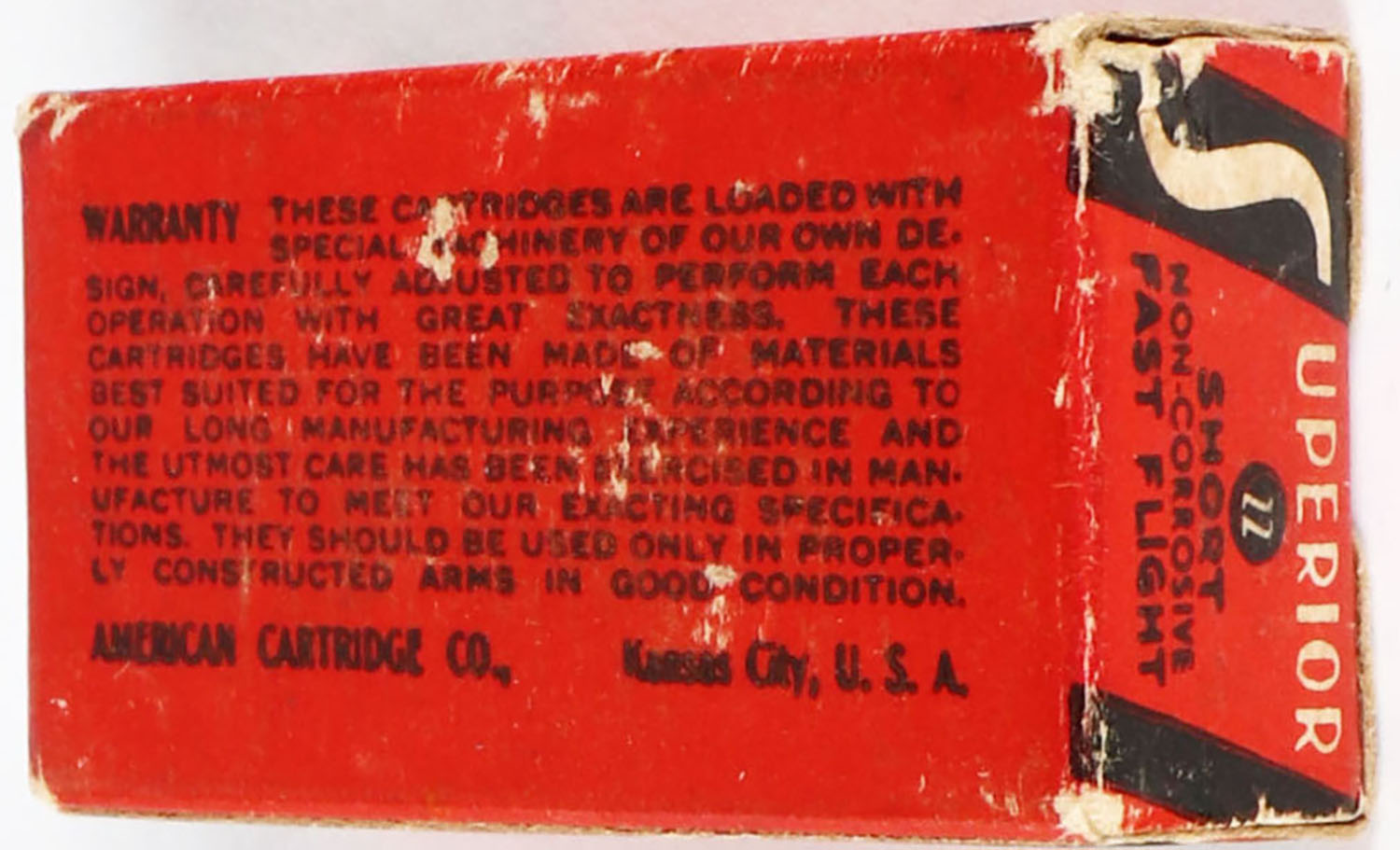 American, Superior Cartridges, .22 Short, Fast Flight, RHWeb: ACC-2 S-1b, Full, 1pc. Red black & buff box, box is solid with very good color, some age soiling & corner wear, very minor edge wear, end flaps are solid, ammo is excellent. Grade: Very Good ++ - Value: 8 to 40